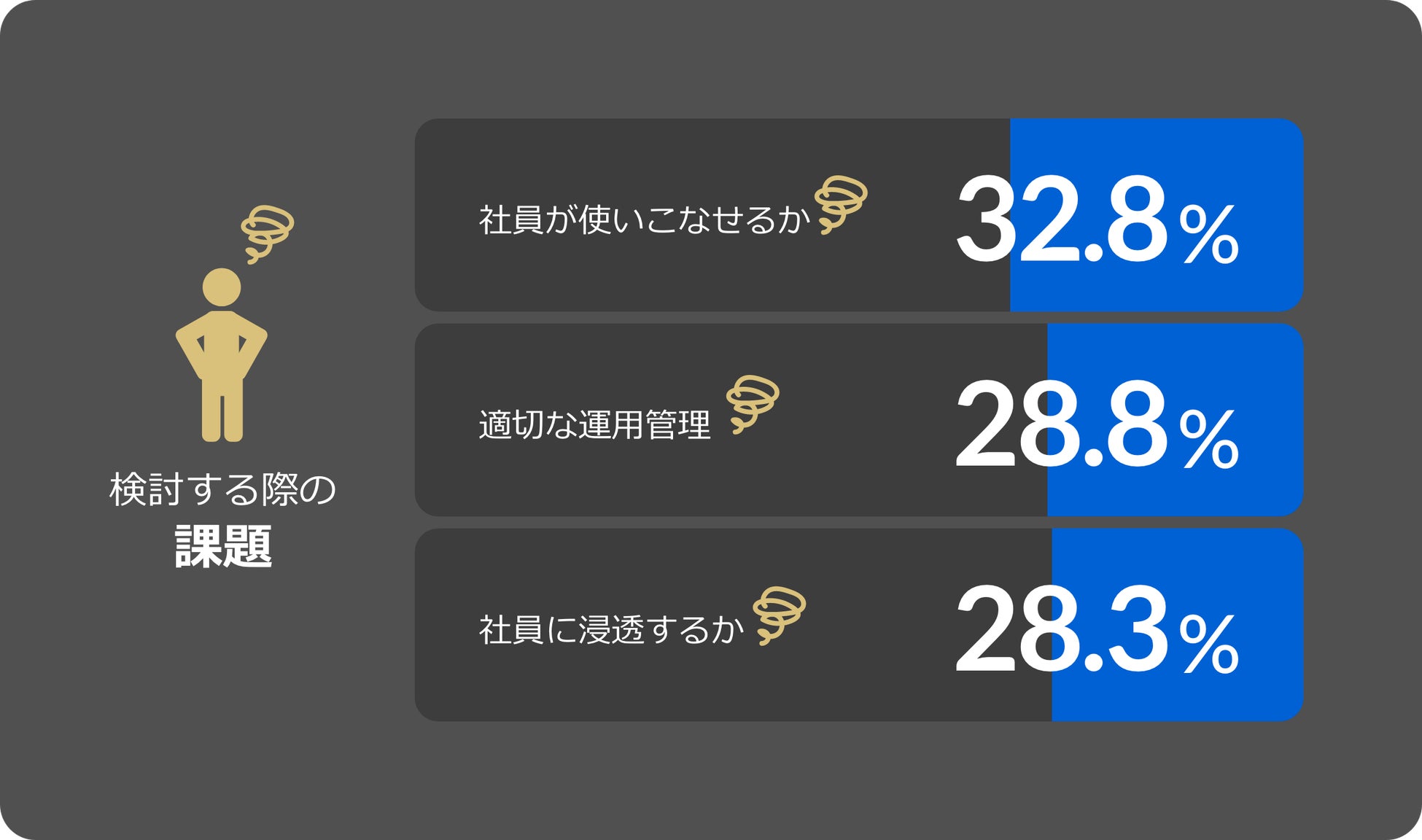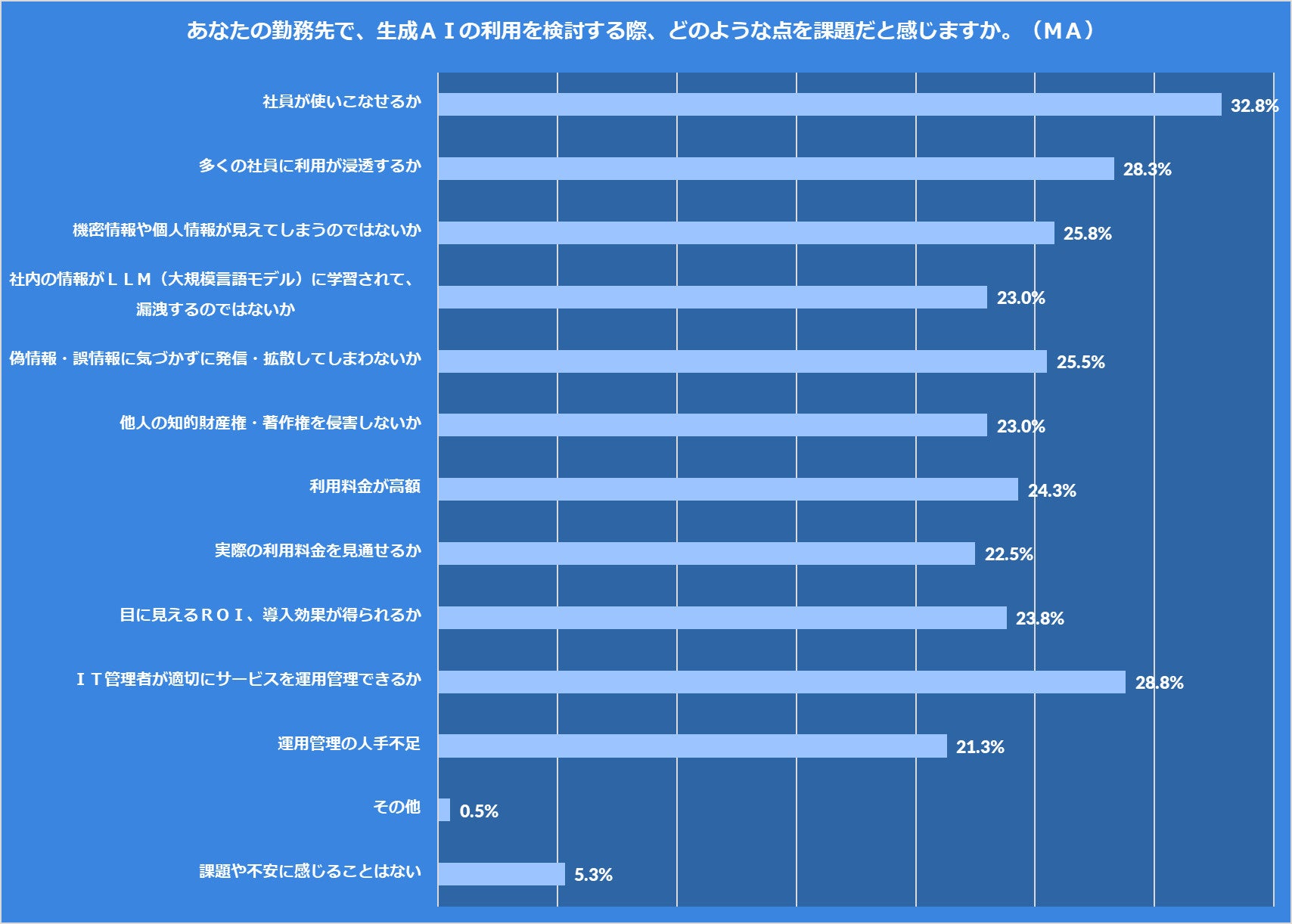 これから生成AIを導入する企業においても、94.7%の導入関与者が何らかの課題や不安を抱えており、導入済み企業と同じく、「社員が使いこなせるか」が32.8%と最も多く課題となりました。