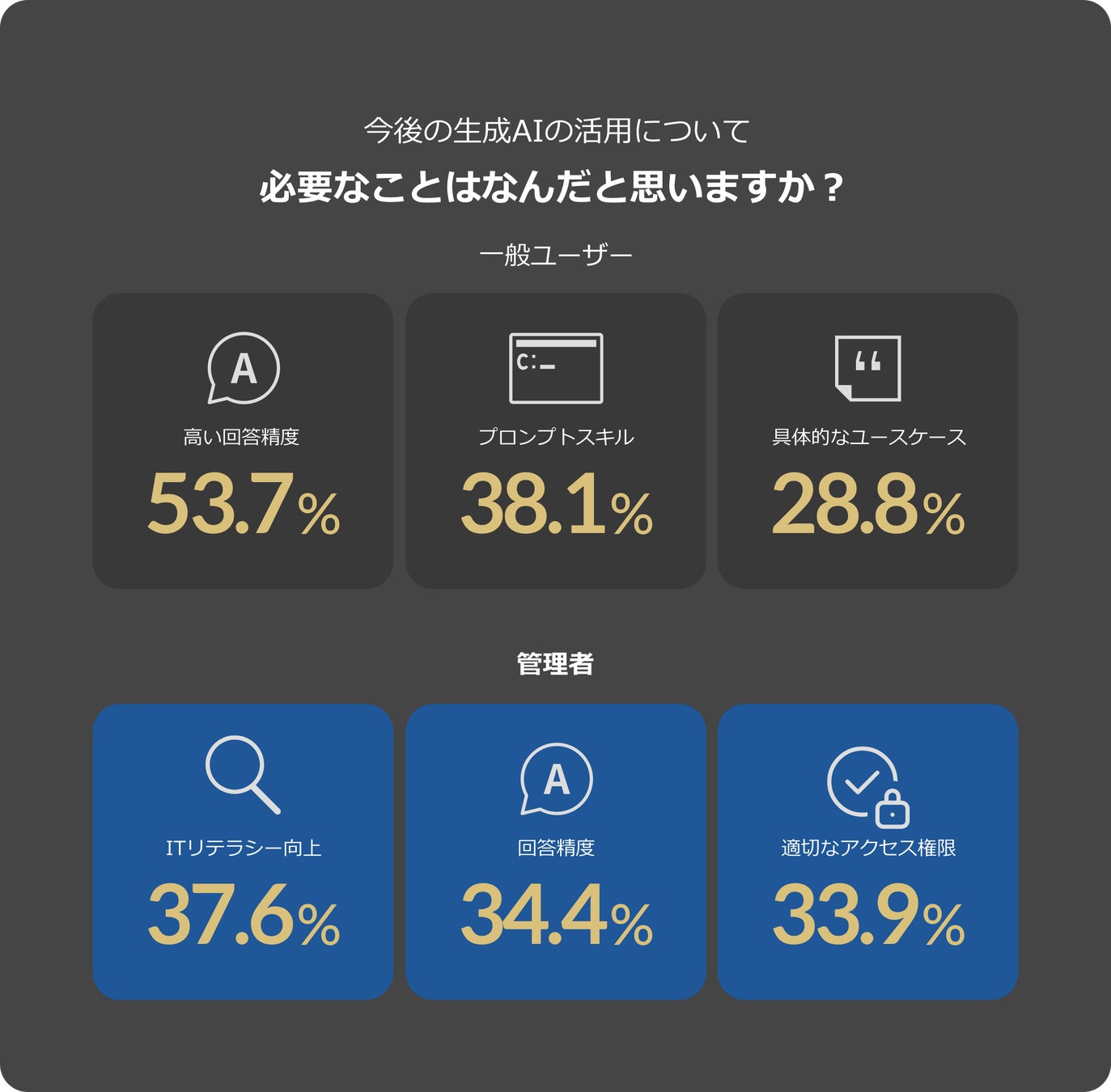 また、前問で「活用していきたい」、「やや活用していきたい」と回答した方へ、今後の生成AIの活用に何が必要か尋ねたところ、利用者の53.7%が「高い回答精度」と回答したのに対し、導入関与者・運用担当者では「回答精度の向上」は34.4%に留まり、「ユーザーのITリテラシーの向上」が37.6%、次いで「生成AIで利用するファイルの整理」が36.0%と最も多い結果となりました。