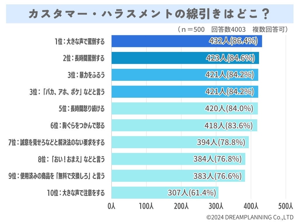 カスタマー・ハラスメントの中で最も多かった回答は「大きな声で罵倒する」でした。