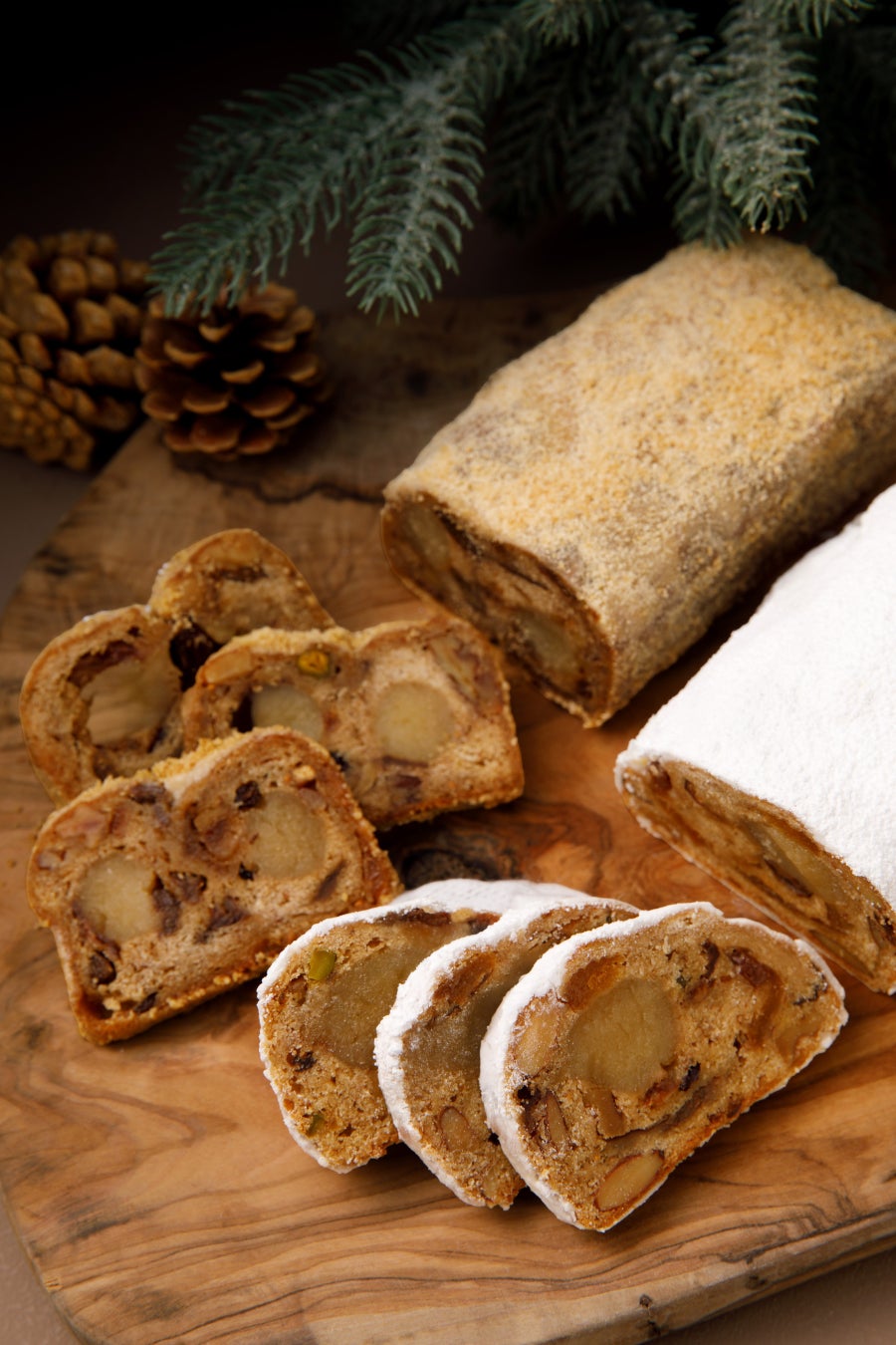 3種の洋酒にじっくりと漬け込んだドライフルーツと、香ばしく焼いたナッツを練りこませた生地をマジパンローマッセとともに焼き上げ、たっぷりの高千穂バターで仕上げたこだわりのシュトーレンです。