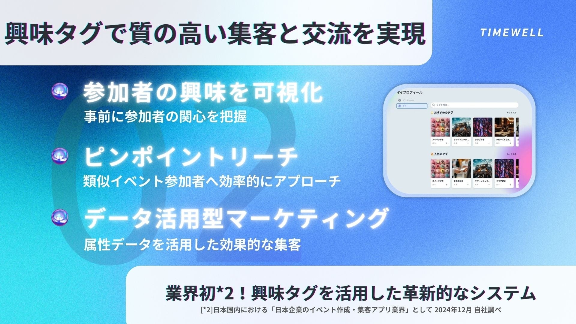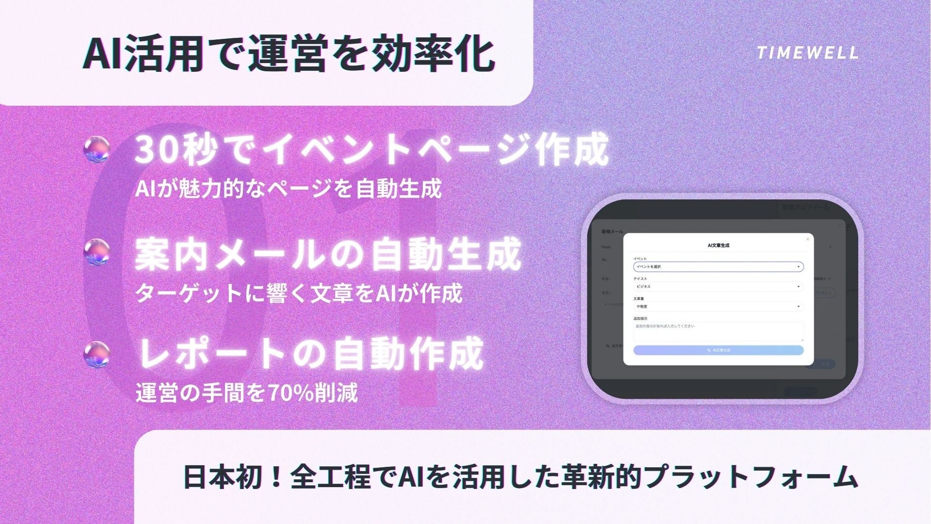 株式会社TIMEWELL(本社:神奈川県横浜市、代表取締役:濱本隆太、以下TIMEWELL)は、生成AIとマッチング機能を搭載した次世代型イベントプラットフォーム「TIMEWELL Base」のオープンβ版を本日リリースしました。イベントの準備段階から、開催中、そしてイベント後まで、すべての工程で主催者と参加者双方の体験を革新する機能を搭載しており、イベント運営者は必見です。また、IT導入補助金にも採択されており、中小事業者が有償版を利用する場合、一定の割引が適用されます。