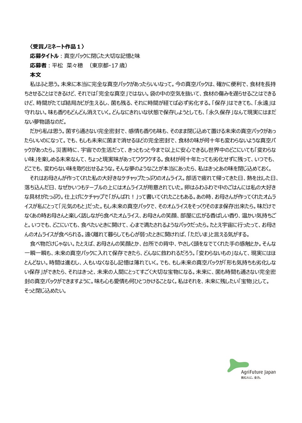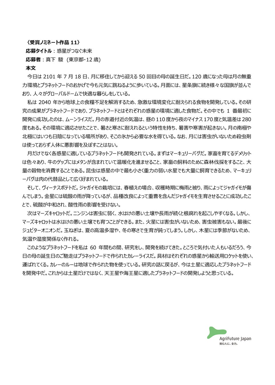 一般社団法人アグリフューチャージャパン(理事長:合瀬宏毅、東京都港区)が開催する第三回『未来エッセイ2101』 (以下、本コンテスト)の受賞ノミネート作品を選出いたしました。