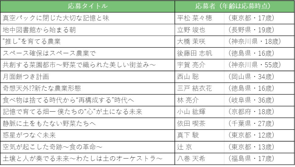 ご応募いただきました作品は、食や農業の分野でご活躍されている審査員により、厳正な審査を行った結果、「最優秀賞」1作品、「優秀賞」2作品、「協賛会員賞」10作品の受賞ノミネート作品を以下のとおり選出いたしました。