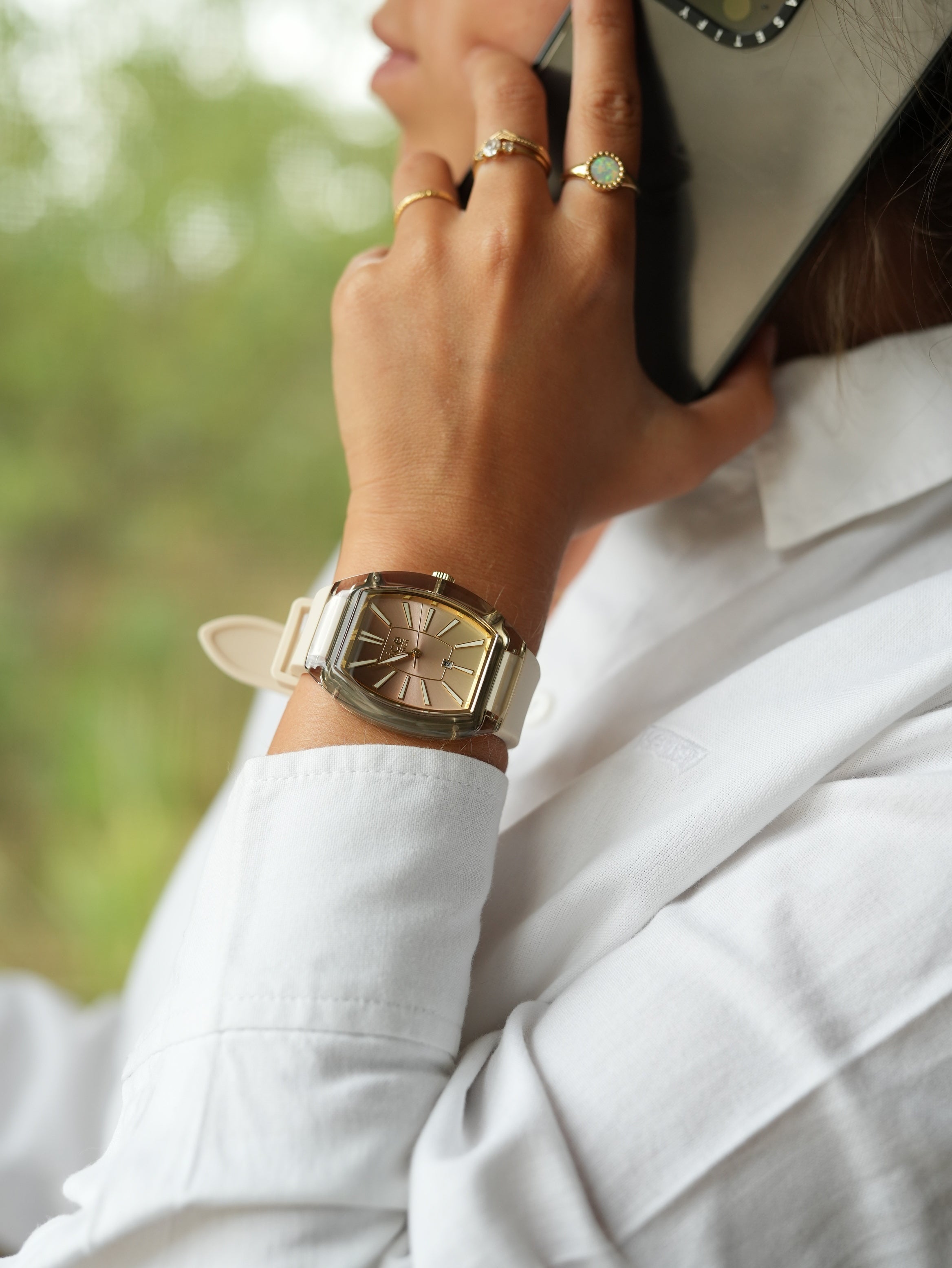 新作「アイスボリデイドーム」は、未来的なフォルムでありながらもヴィンテージ感を漂わせる丸みを帯びたトノーケースデザインが特徴。緩やかなカーブを描くケースは、手首にアートピースを纏うような感覚をもたらし、女性らしさと遊び心を一層引き立てます。