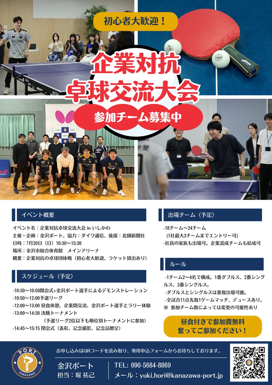プロ卓球チームの金沢ポートは2025年7月20日(日)、金沢市総合体育館にて「企業対抗卓球交流大会 in いしかわ」を開催いたします。