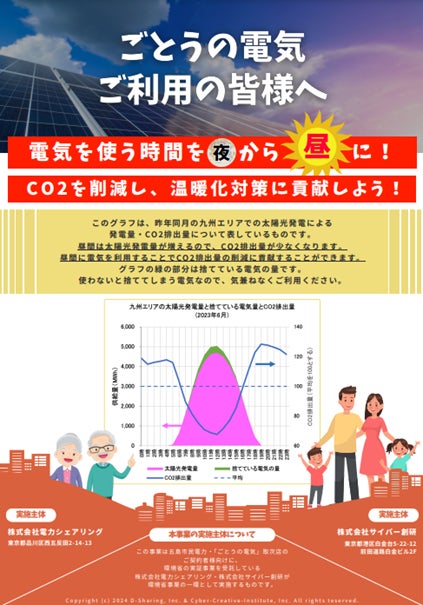 具体的には、一部の需要家には、昼12~13時の電力使用量が、直前の11~12時の使用量を超えた場合、特に再生可能エネルギーの余剰が発生しやすい昼12~13時の電気料金を無料とすることで、金銭的インセンティブを付与するとともに、以下のようなチラシを配布するなどして、消費の昼シフトでCO2を削減できることを訴求しました。