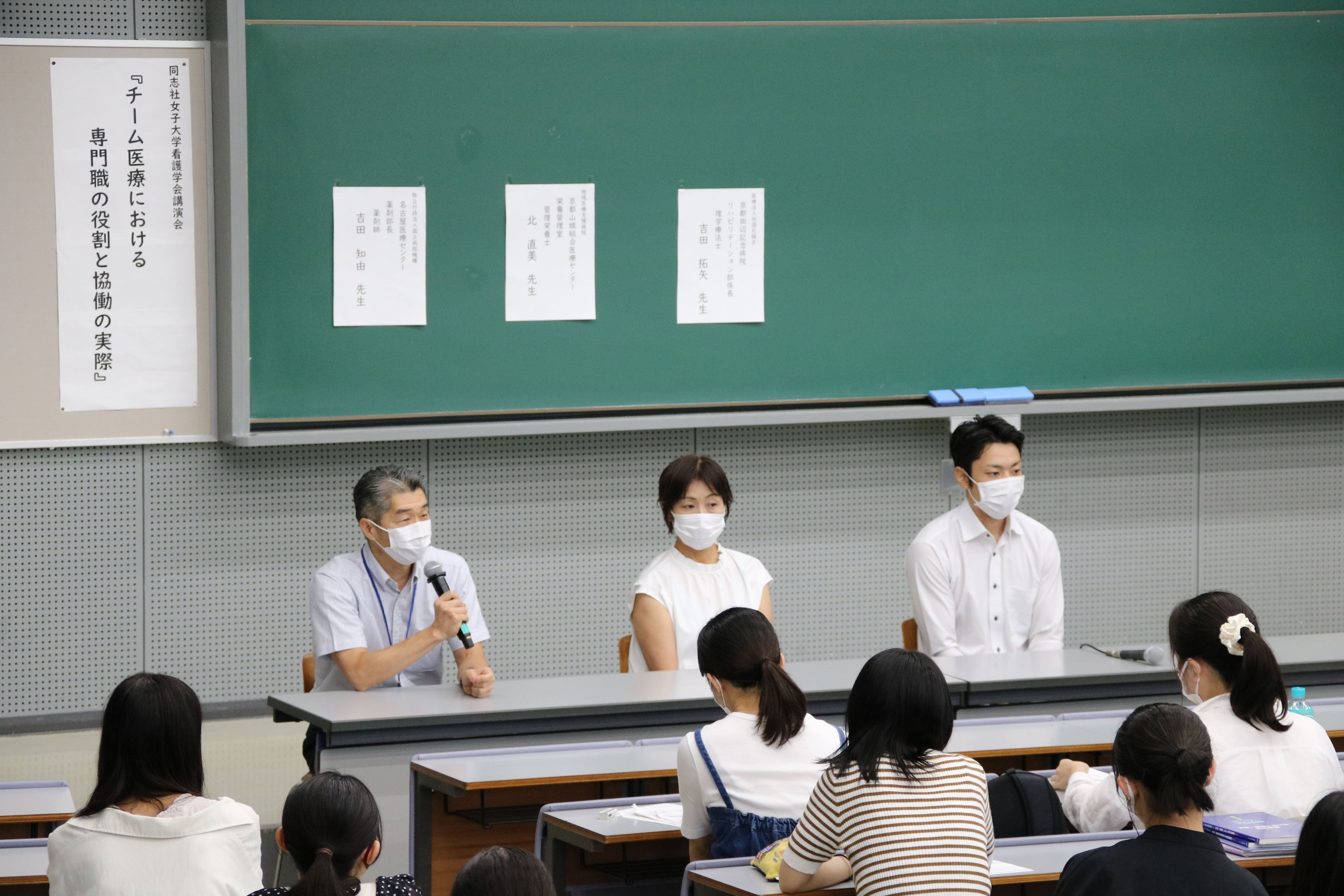 今年度は、薬剤師、管理栄養士、理学療法士として医療現場で活躍する方を外部講師として迎え、「病院薬剤師に求められる業務からのチーム医療」(独立行政法人国立病院機構名古屋医療センター薬剤師の吉田知由氏)、「多職種で取り組む食支援~生きることは食べること~」(地域医療支援病院京都山城総合医療センター管理栄養士の北直美氏)、「療法士目線のチーム医療-当院における看護師との連携および協働の実際」(医療法人石鎚会京都田辺記念病院理学療法士の吉田拓矢氏)と題し、医療現場でのそれぞれの職種の取り組み内容や、現場で看護職に期待することなどについてご講演いただきました。