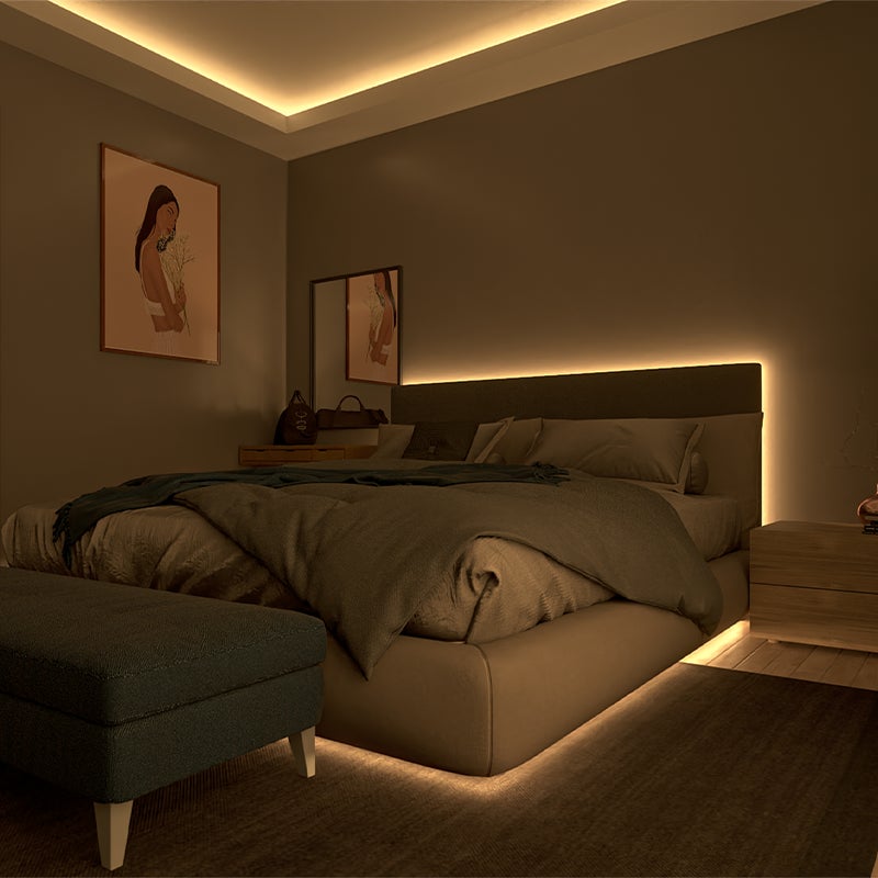 寝室の演出のほか、デスク周り、カーテンレール、階段の手すり、ディスプレイ棚など、さまざまな場所の間接照明としておすすめです。