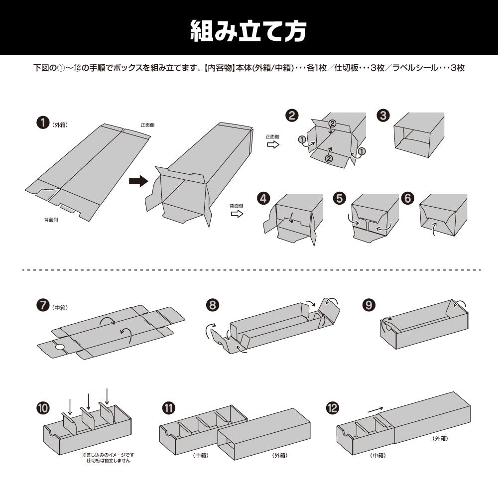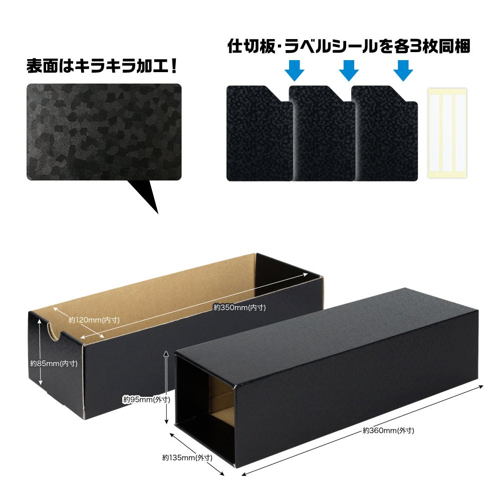 仕切り版・名前シールを3枚ずつ同梱しており、デッキやカード種別ごとに分けて収納可能です。