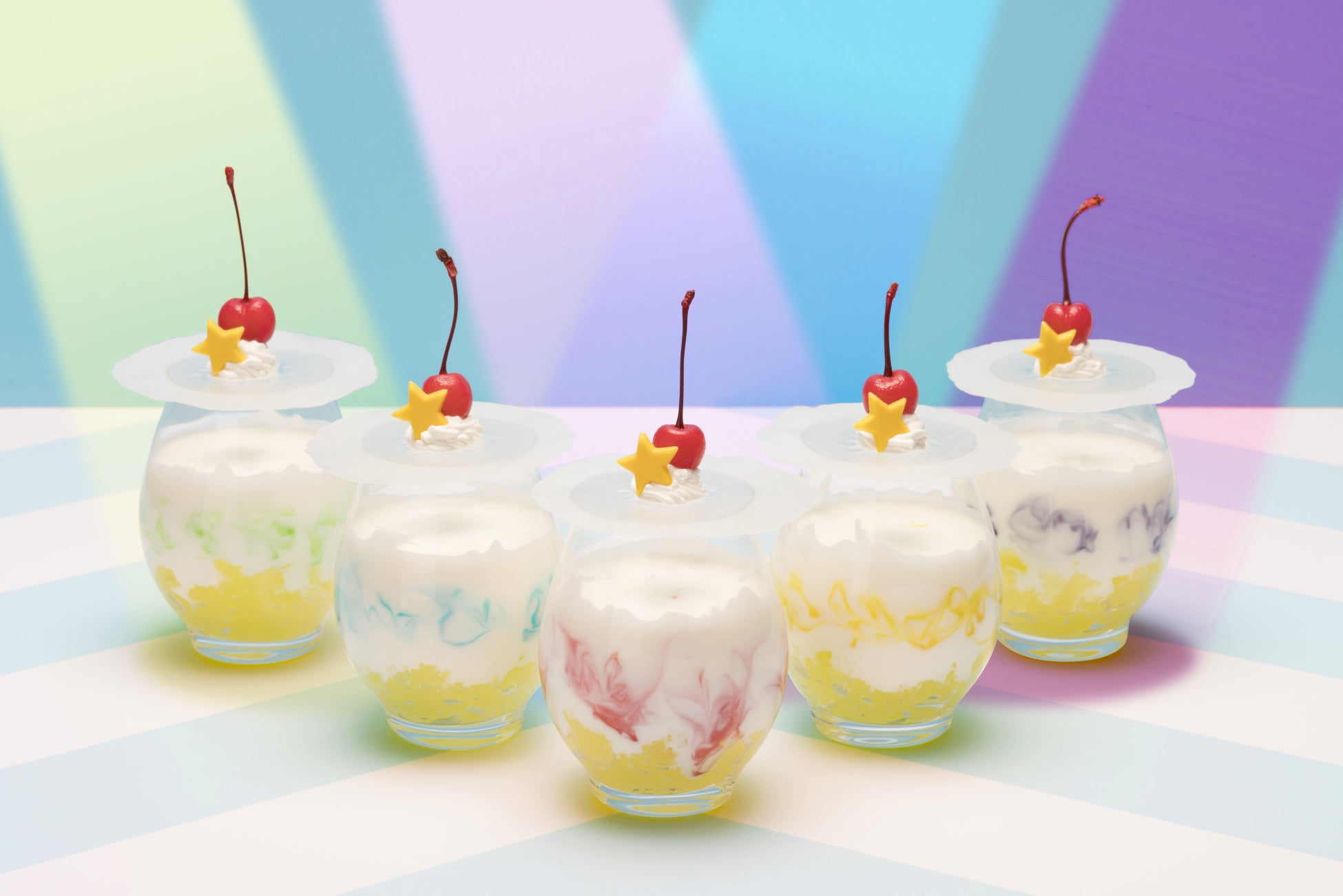 推し活をテーマにしたアイドル衣装がモチーフのさっぱりとしたヨーグルトドリンクです。グラスの底にはクラッシュパイナップルゼリーが敷き詰められ、その上に酸味のあるフローズンヨーグルトを重ねました。爽やかな味わいとゼリーのぷるぷる食感をお楽しみいただけます。さらにグラスのトップには、薄くパリパリとした食感が楽しめる飴と、アイドルの髪飾りに見立てた星形のチョコ、そしてさくらんぼがトッピングされています。5色のドリンクから推しカラーを見つけてお楽しみください。デザートビュッフェ「NEO SHOWA POP! (ネオ昭和ポップ!)」開催期間限定、追加料金にてご注文いただけます。