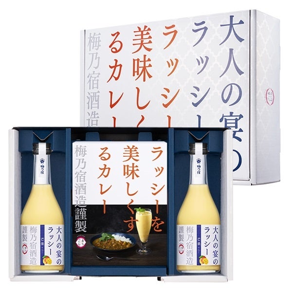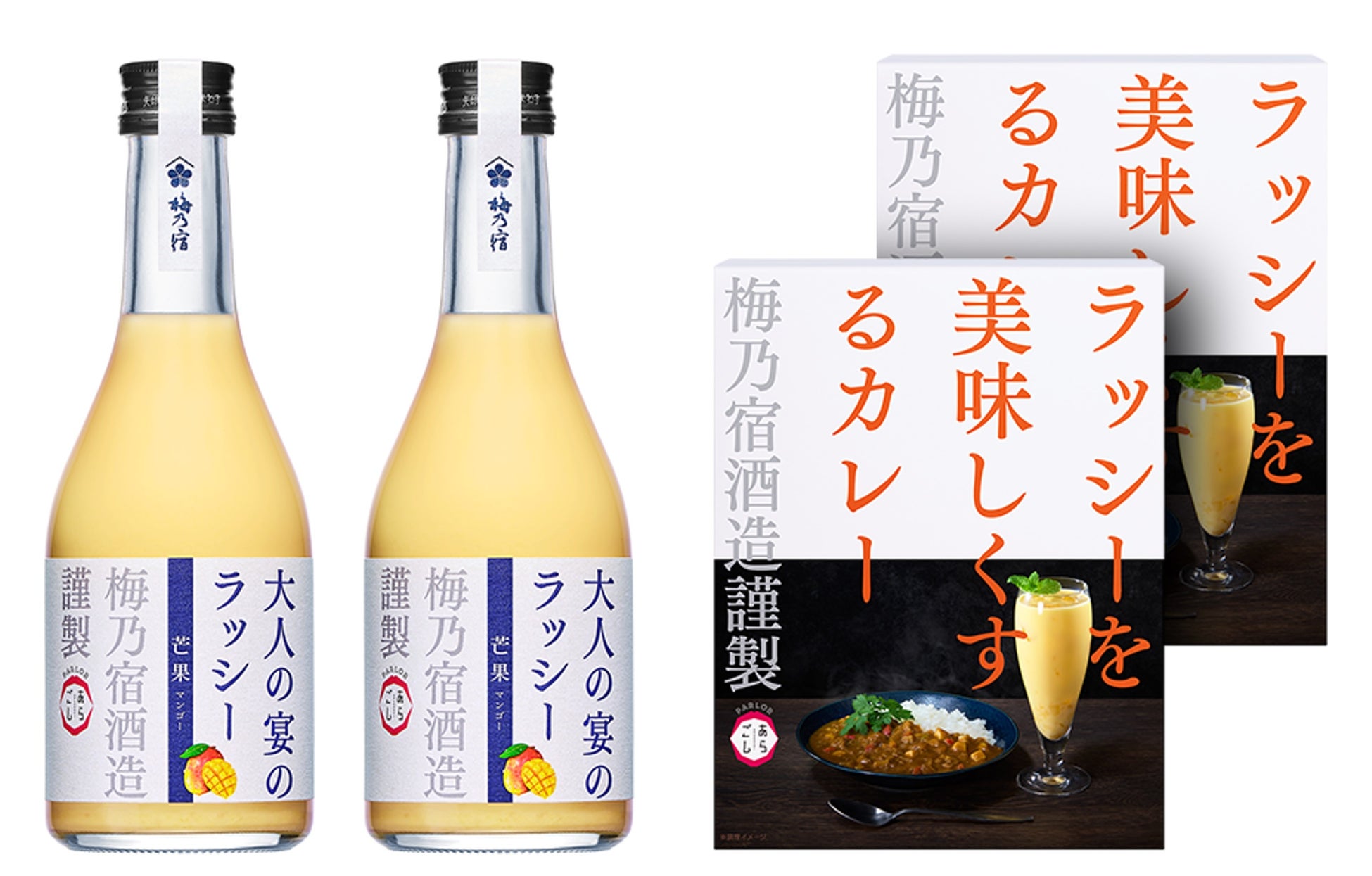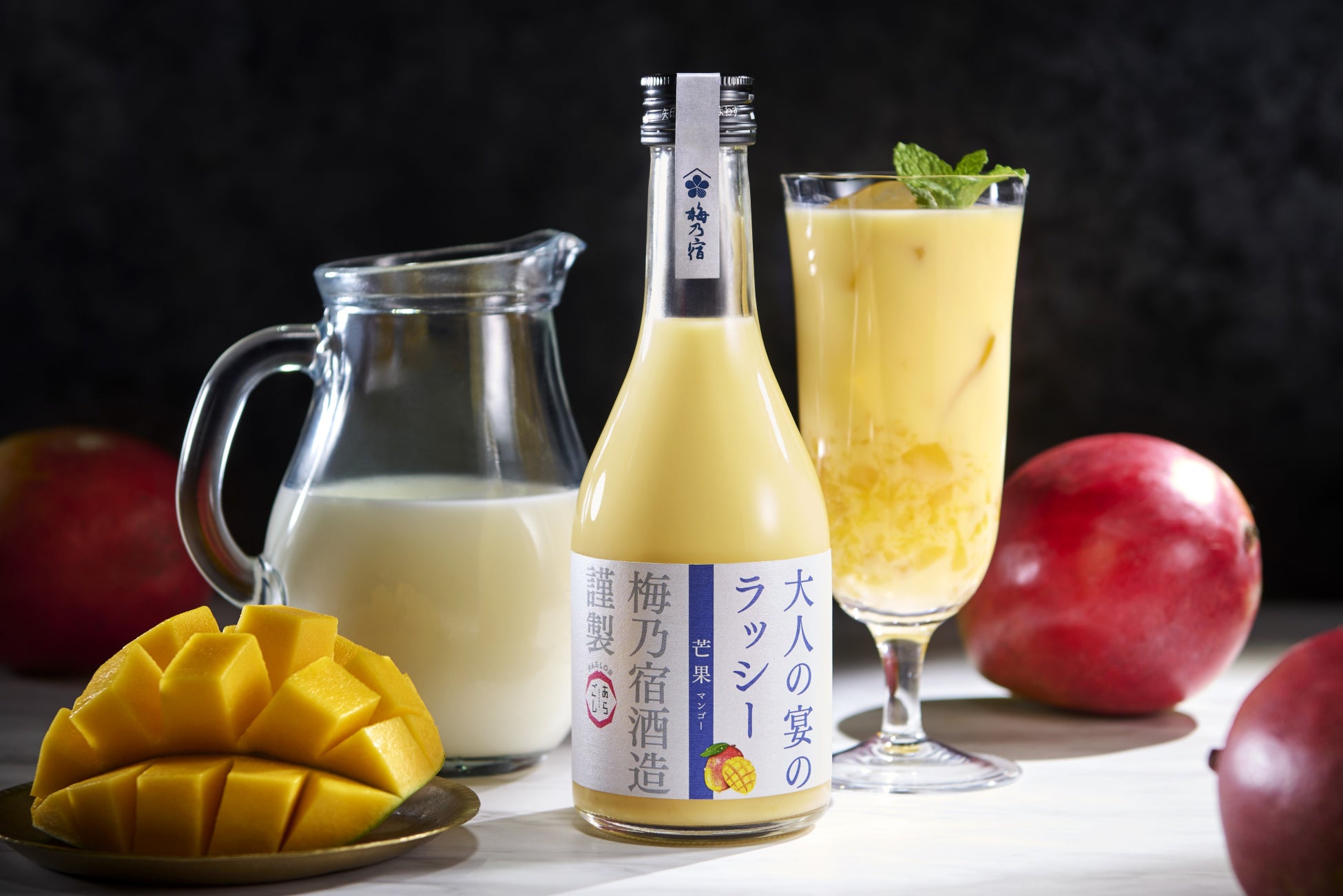 梅乃宿酒造は2024年12月に、マンゴーの果肉感がたのしめるラッシーのお酒「大人の宴のラッシー『芒果(マンゴー) 』 」と、あらごし梅酒を隠し味として使用して、ラッシーのお酒とのマリアージュが絶妙な「ラッシーを美味しくするカレー」を発売しました。