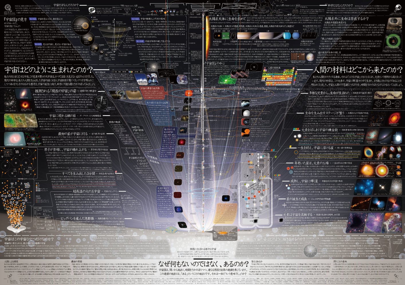 私たちが住むこの宇宙は、いったいどんな世界なのでしょうか。文部科学省が発行する科学ポスター「一家に1枚宇宙図」は、そんな素朴な疑問に応えるべく、最新の天文学が解き明かした宇宙の姿を示したものです。宇宙の始まりから現在に至るまで、そこでいったいなにがあったのかを描いたシンプルな図なのですが、難しい漢字も多く使われており、読むためのハードルを上げてしまっていることが課題となっていました。今回、デジタル化するにあたって、”ルビフルボタン“を導入することによってこの課題を解決することができました。ぜひ多くの方に宇宙を味わっていただければと思います。