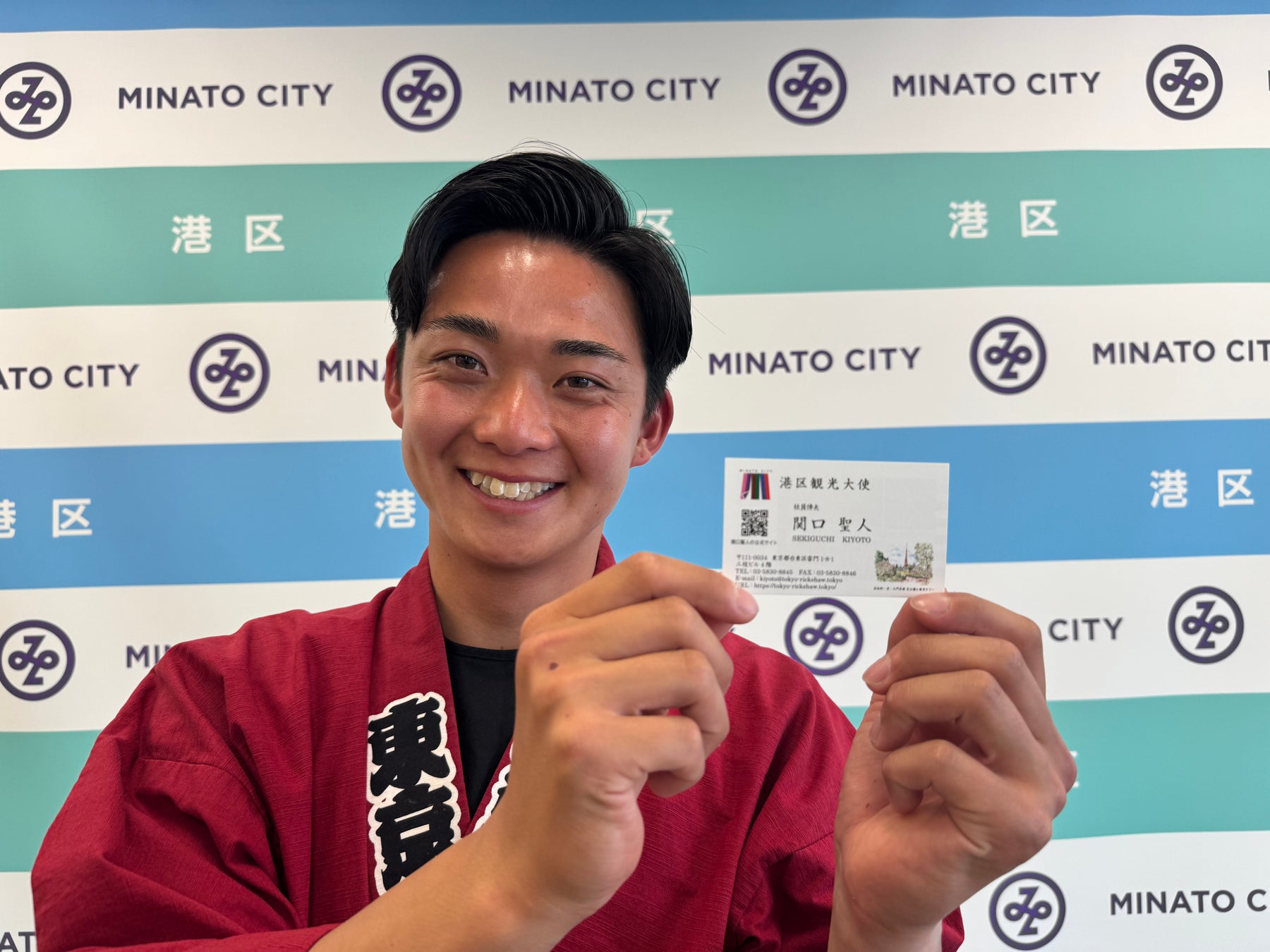関口聖人は、これまで「東京力車」の俥夫として、浅草を中心に、国内外から訪れる多くのお客様を温かくお迎えし、街の魅力を余すことなく案内してまいりました。 その活動に加え、【東京力車】が新橋のエンターテイメントビル「グランハマー」前に人力車乗り場を開設し、関口聖人が責任者として港区新橋エリアの街の魅力を伝えることにも専念してまいりました。港区の街の魅力を伝えてまいりました活動が、港区の観光大使としてふさわしいと評価され、今回の栄誉ある任命に至りました。