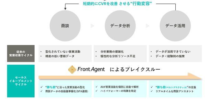 「Front Agent®」を活用し、AIによるハイパフォーマーの科学から成果につなげる商談モデルの特定、高度且つリアルタイムな分析機能による評価のフィードバック、商談の“勝ち筋”の特定と可視化を実現することで、営業活動の最大化につなげます。これによりこれまで感覚的であった育成サイクルをデータや数値に基づいた育成に改善し、短期的且つ持続的に成果を生む“行動変容”につなげます。