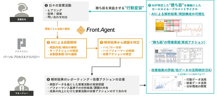 本サービスは、この両社の強みを活かし、営業組織における課題整理から「Front Agent®」の導入支援、定着化に向けた運用設計、育成サイクルのコンサルティング支援、日々の業務への実装までを一気通貫で提供し、企業の営業成果の創出につなげます。