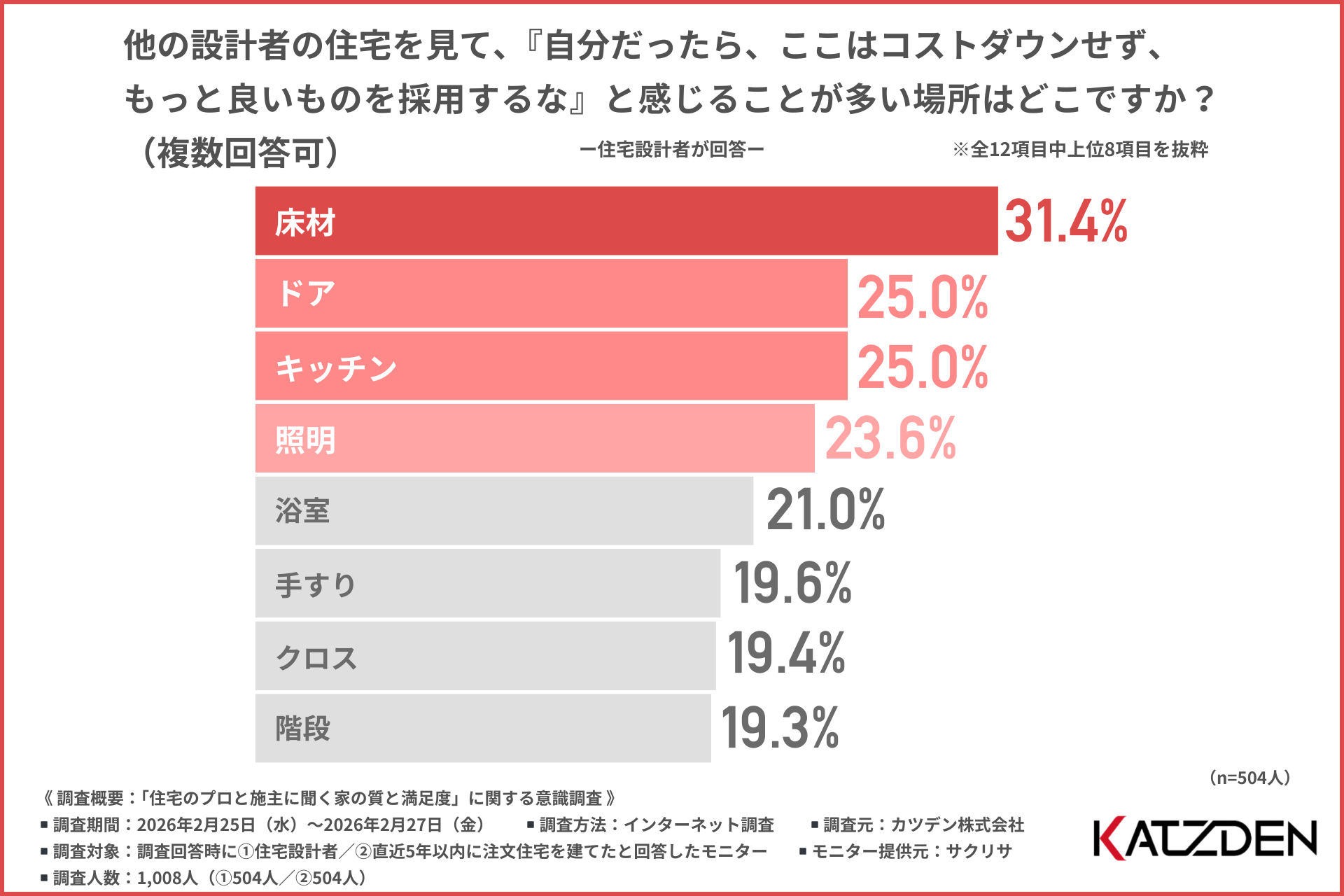 「他の住宅設計者の住宅を見て、『自分だったら、ここはコストダウンせず、もっと良いものを採用するな』と感じることが多い場所」について尋ねたところ、『床材(31.4%)』と回答した方が最も多く、『ドア(25.0%)』『キッチン(25.0%)』『照明(23.6%)』が上位に挙がりました。