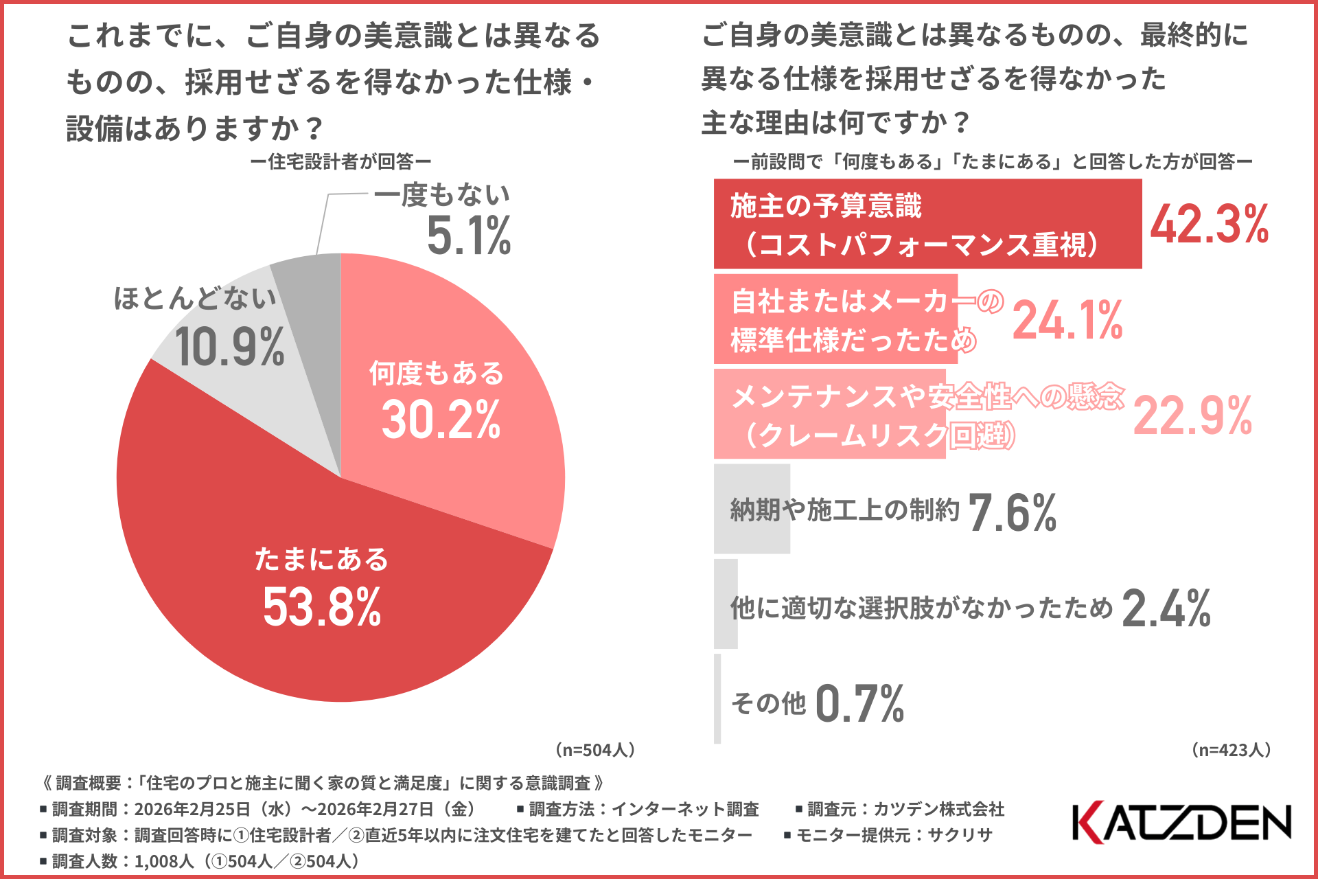 次に、前問で『何度もある』『たまにある』と回答した方に、「ご自身の美意識とは異なるものの、最終的に異なる仕様を採用せざるを得なかった主な理由」について尋ねたところ、『施主の予算意識(コストパフォーマンス重視)(42.3%)』と回答した方が最も多く、『自社またはメーカーの標準仕様だったため(24.1%)』『メンテナンスや安全性への懸念(クレームリスク回避)(22.9%)』と続きました。