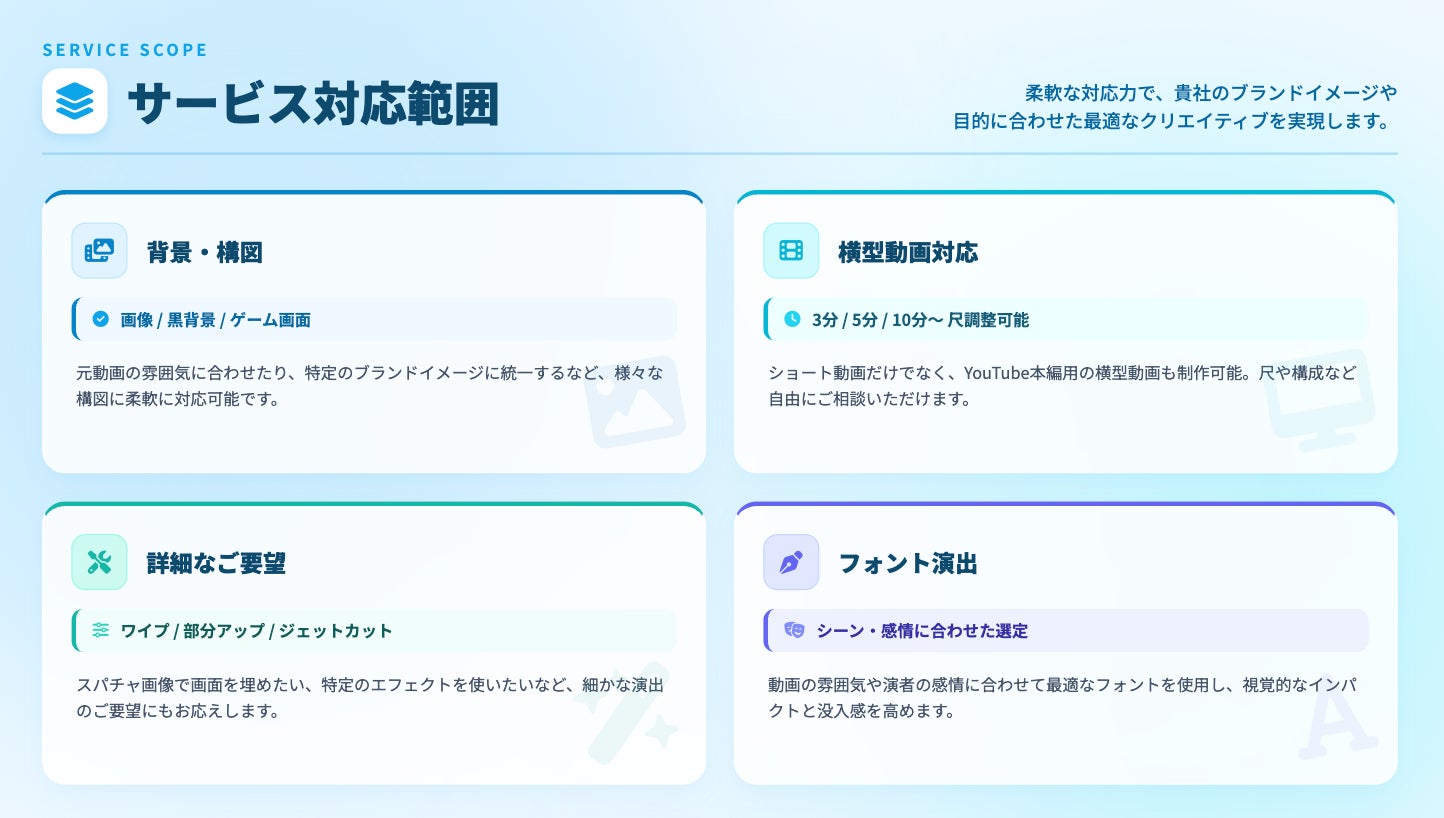 本サービスは、単なる動画編集代行ではありません。「クリエイティブ」「マーケティング」「SNS・拡散」の3つの専門領域を1つのチームに集約し、戦略的なディレクションを行います。