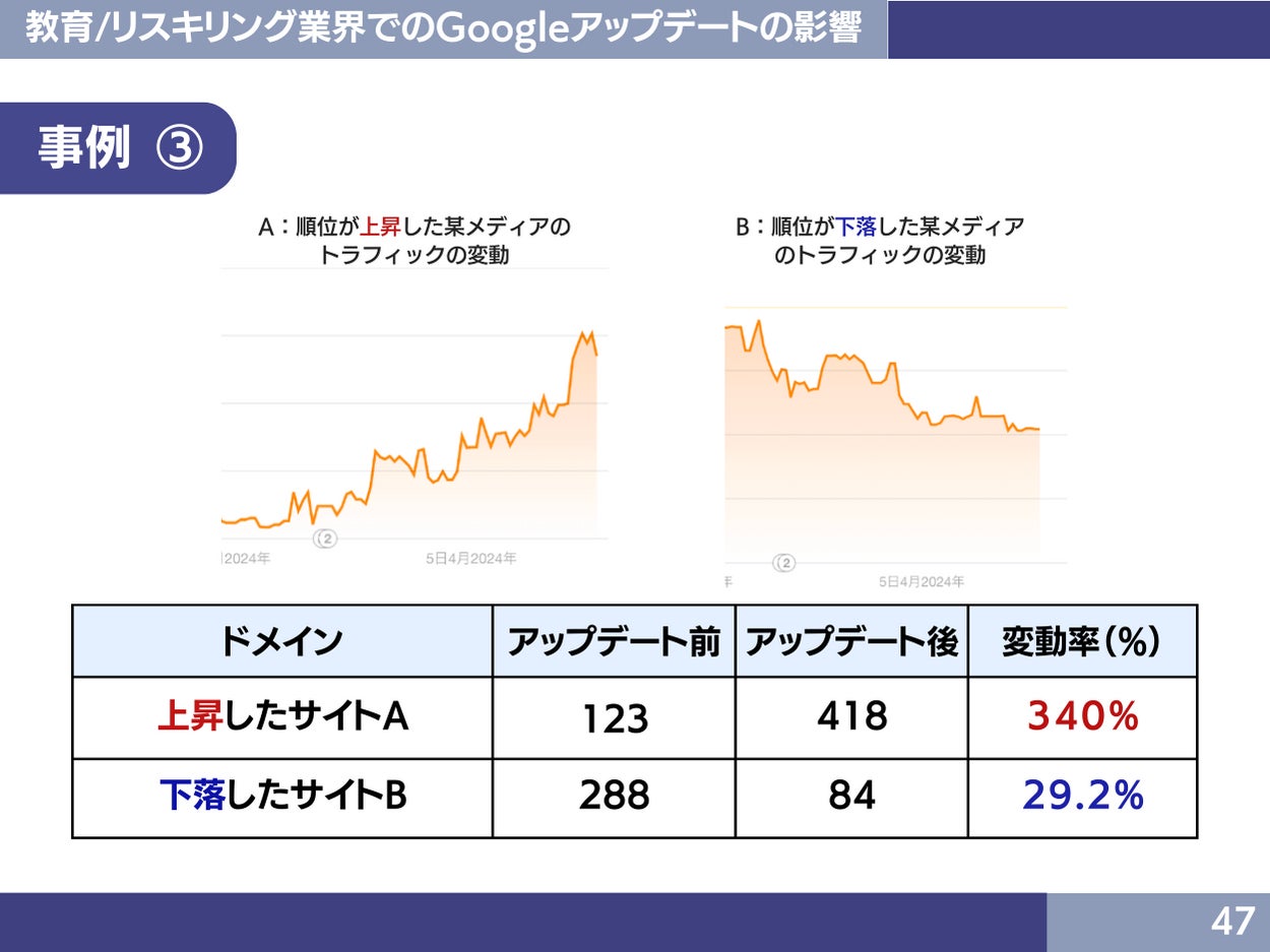 2024年4月に完了したGoogleアップデートにより、教育/リスキリング業界の各サイトのトラフィックに変動が起きています。今回のアップデートでは、以下の内容を反映しているサイトがポジティブな影響を受けています。