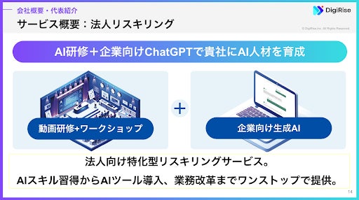 株式会社デジライズは「AIの利便性と感動を全ての人へ」をビジョンとして2023年に事業を開始しました。「法人リスキリング®︎」というAI研修(動画学習+ワークショップ)と自社開発の企業向けChatGPT「AI Works」を提供するサービスを、上場企業を筆頭に多くの企業様に導入を進めております。