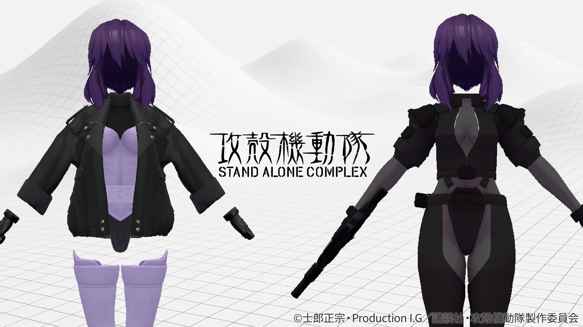 『攻殻機動隊 STAND ALONE COMPLEX』との公式コラボファッションアイテムとして、劇中で草薙素子たちが実際に着用している衣装や光学迷彩エフェクトを忠実に再現し、VRChatで使用可能なデジタルファッションとして提供します。
