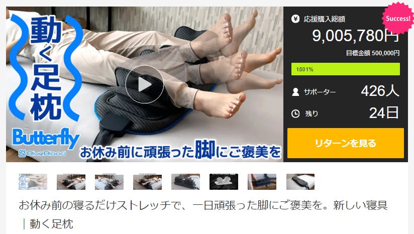 次世代寝具動く足枕「バタフライフットピロー」のMakuake先行販売が8月30日に終了。