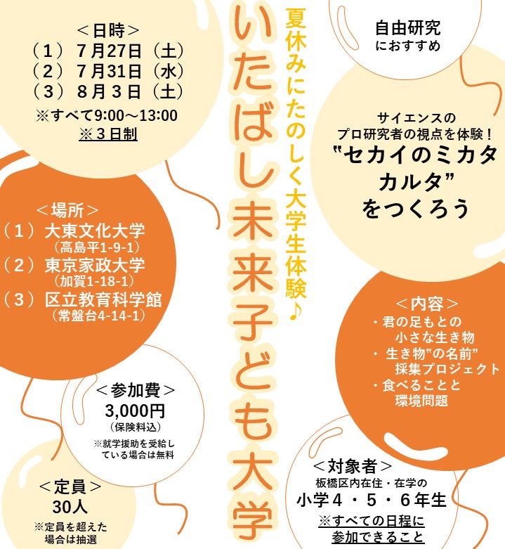 板橋区教育委員会は、大学施設を利用し、教授や専門家等による講義や体験活動を通した学びの場「いたばし未来子ども大学(※)」を新たに開講します。