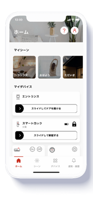 ・「おはよう」「行ってきます」といった「シーン」機能や、時間や位置情報などを実行条件とする「自動モード」の活用で、複数のIoT機器をまとめて動かし、設定どおりの住空間の制御が可能