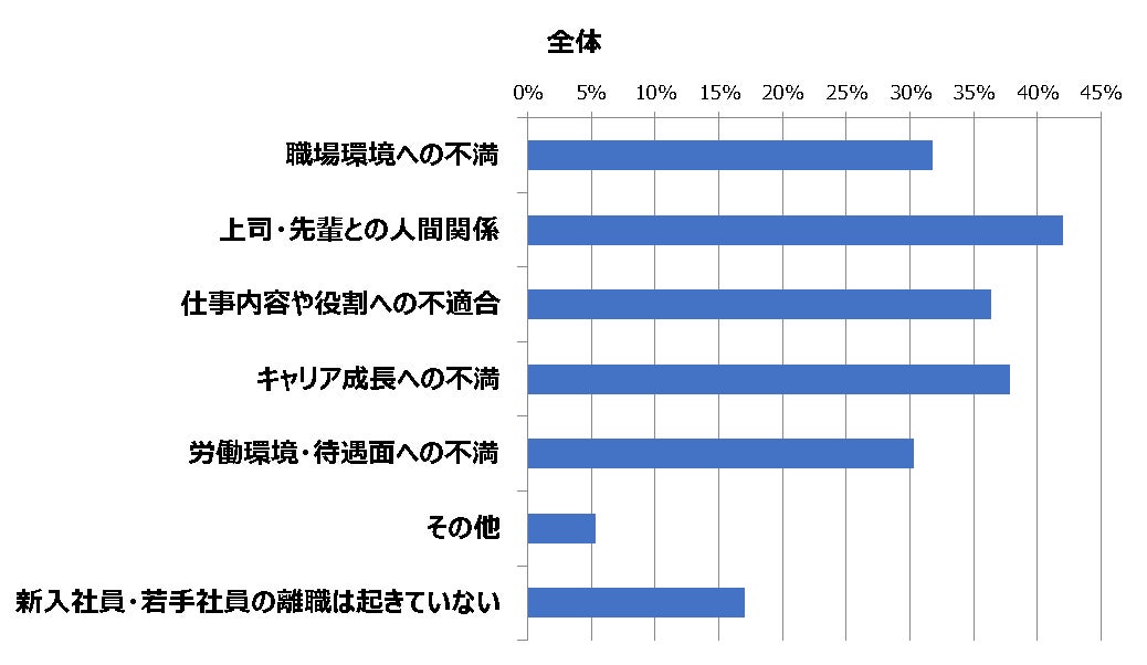 ①「新人・若手の離職理由として感じている要因で最も多かった回答が『上司・先輩との人間関係』が42%」