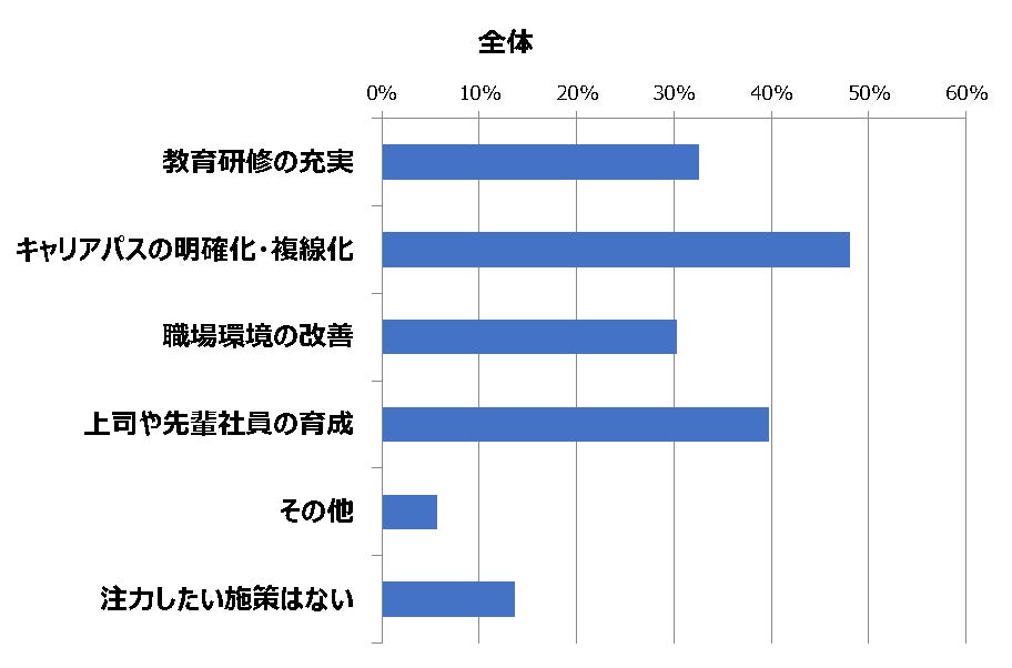 ④ 今後注力したい施策で最も多かった回答が「キャリアパスの明確化・複線化」で48%、次いで、「上司や先輩社員の育成」が40%