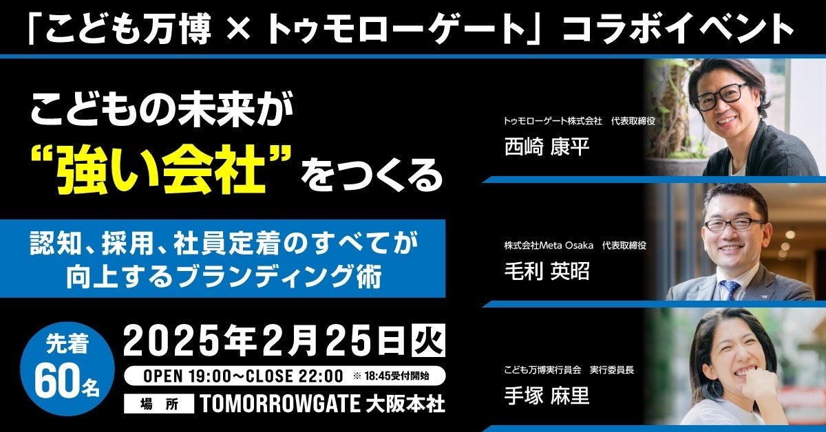 『こども万博』を主催する株式会社Meta Osaka(所在地:大阪市中央区、代表取締役:毛利英昭、以下当社)は、企業ブランディングを手掛けるトゥモローゲート株式会社(所在地:大阪市、代表取締役:西崎康平)と「ブランディングパートナー」契約を締結いたしました。『こども万博』は、全国で累計4万人を動員し、子どもの夢を応援するイベントとして高い評価をいただいております。今回のパートナーシップを通じて、『こども万博』のブランド価値をさらに高め、子どもたちの未来を応援する企業の輪を広げてまいります。これに伴い、2025年2月25日、トゥモローゲート本社にて「こどもの未来」をテーマにしたコラボイベントを開催いたします。