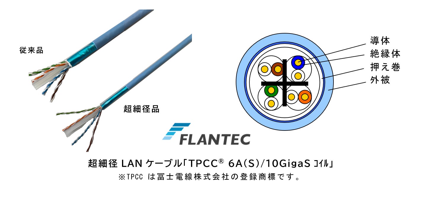 SWCC株式会社(本社:神奈川県川崎市、代表取締役 CEO 社長執行役員:小又 哲夫)のグループ会社である冨士電線株式会社(本社:神奈川県伊勢原市、代表取締役社長:井上和彦、以下「冨士電線」)は、SWCCグループの高速LAN用ケーブルブランド『FLANTEC®(フランテック)』のラインナップを拡充するため、超高速の10Gbps伝送が可能なCategory 6A(以下、Cat.6A)規格に対応した水平配線用のU/UTP仕様の超細径LANケーブル「TPCC® 6A(S)/10GigaSコイル」を業界で初めて販売開始いたします。