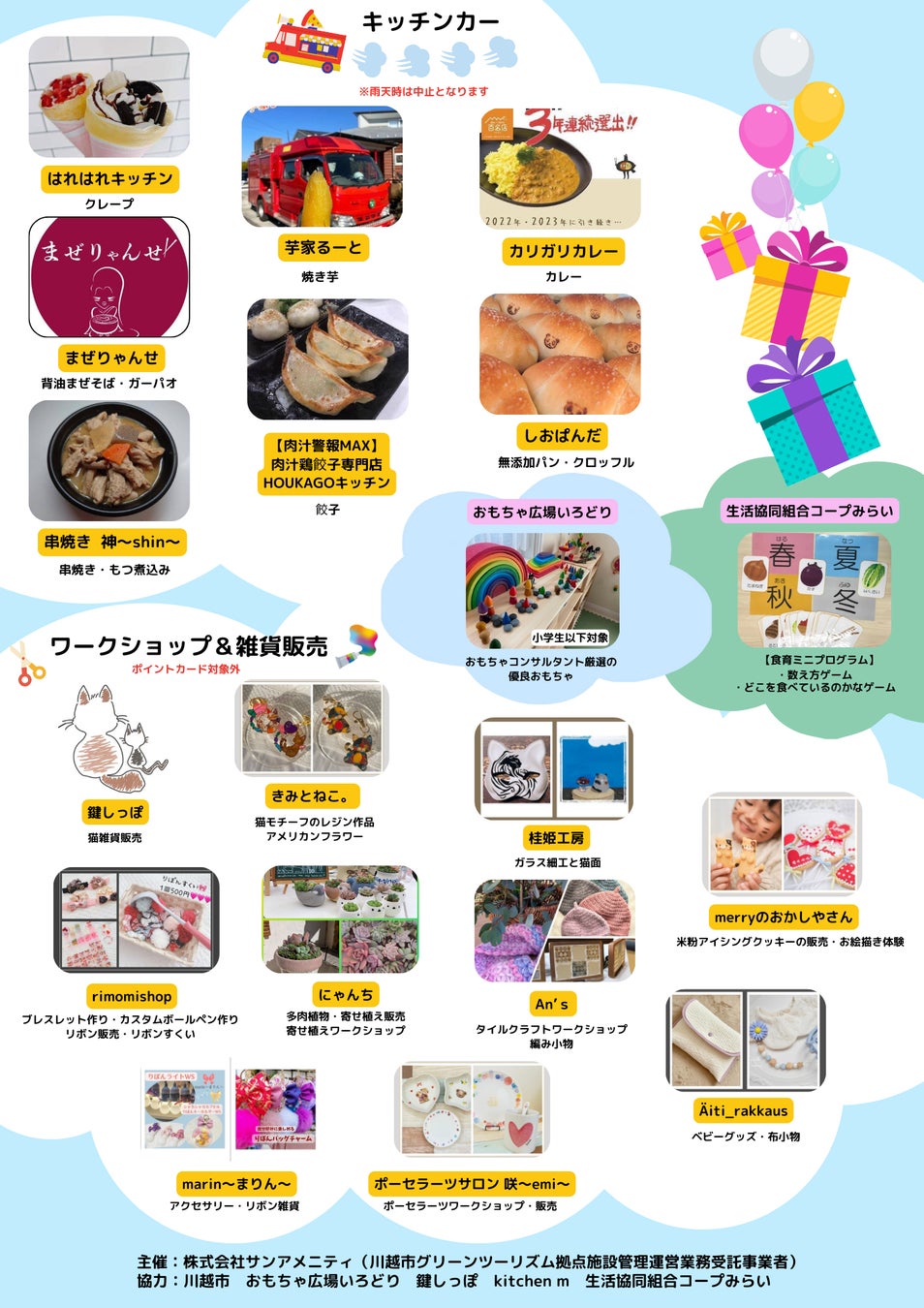川越農家さんの野菜・農産物販売、河越茶の試飲販売、川越を代表する酒蔵『鏡山酒造』を味わえる日本酒飲み比べ、子供も大人も楽しめるイベントやワークショップなど、川越の魅力をたっぷりお届けします!