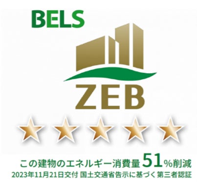 本物件は、BELS(建築物省エネルギー性能表示制度)認定の最高評価(5つ星)を獲得するとともに、「ZEB Ready」 認証を取得しています。