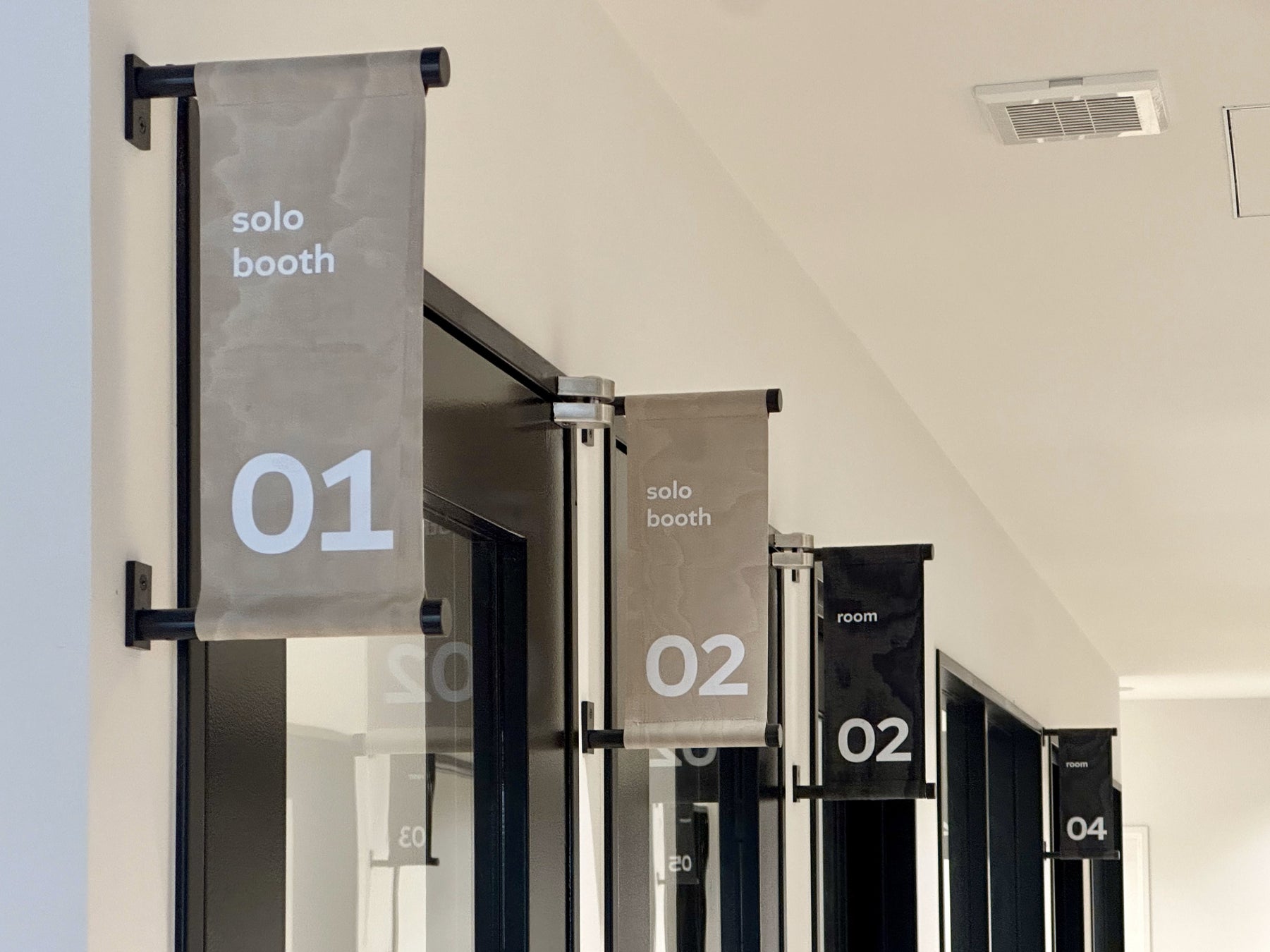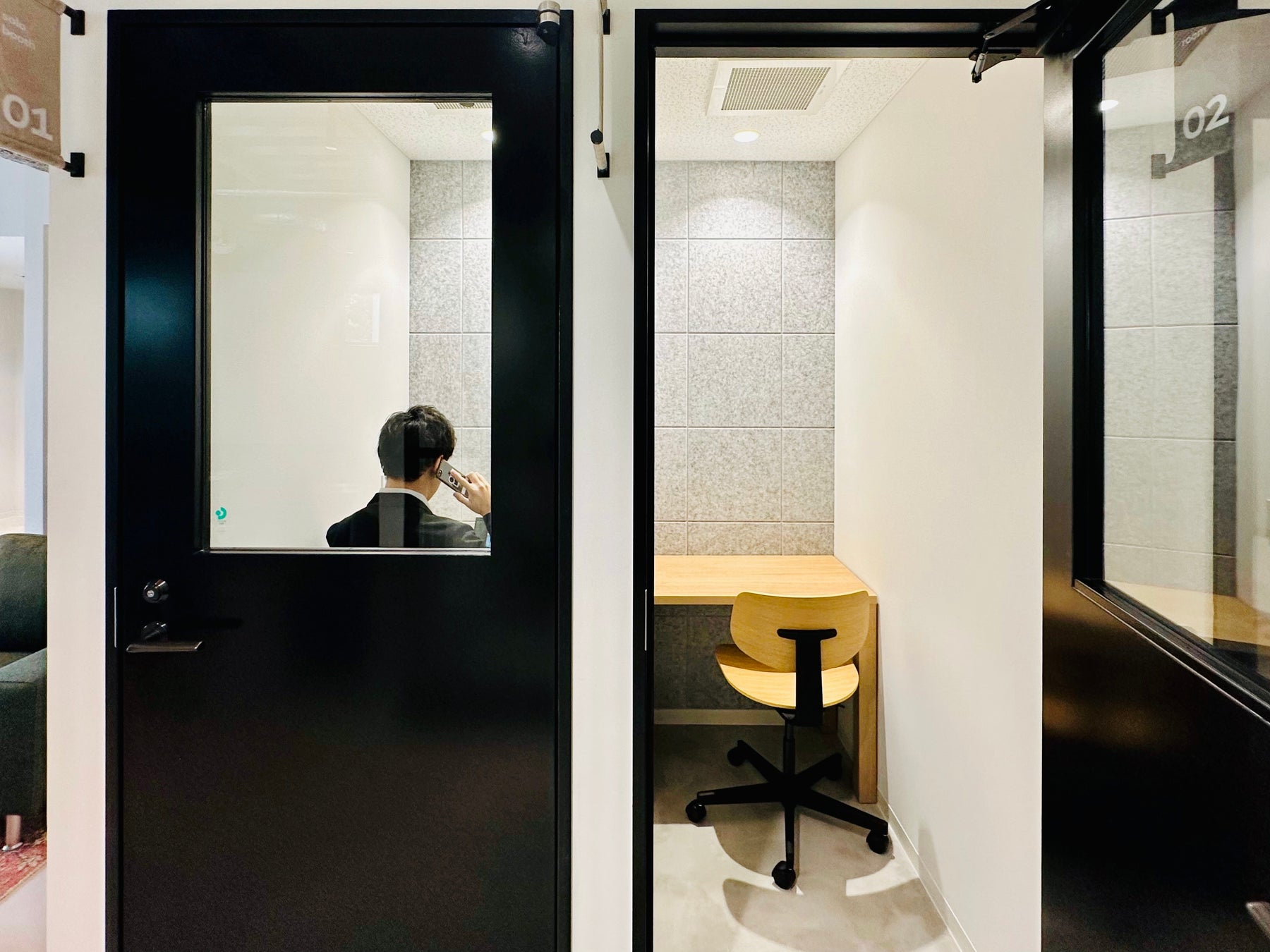 2階には共用の会議室とソロブースを用意しています。スマホやPCが手元にあれば、予約システムを通じていつでもどこでも予約ができ、フレキシブルな働き方をサポートします。