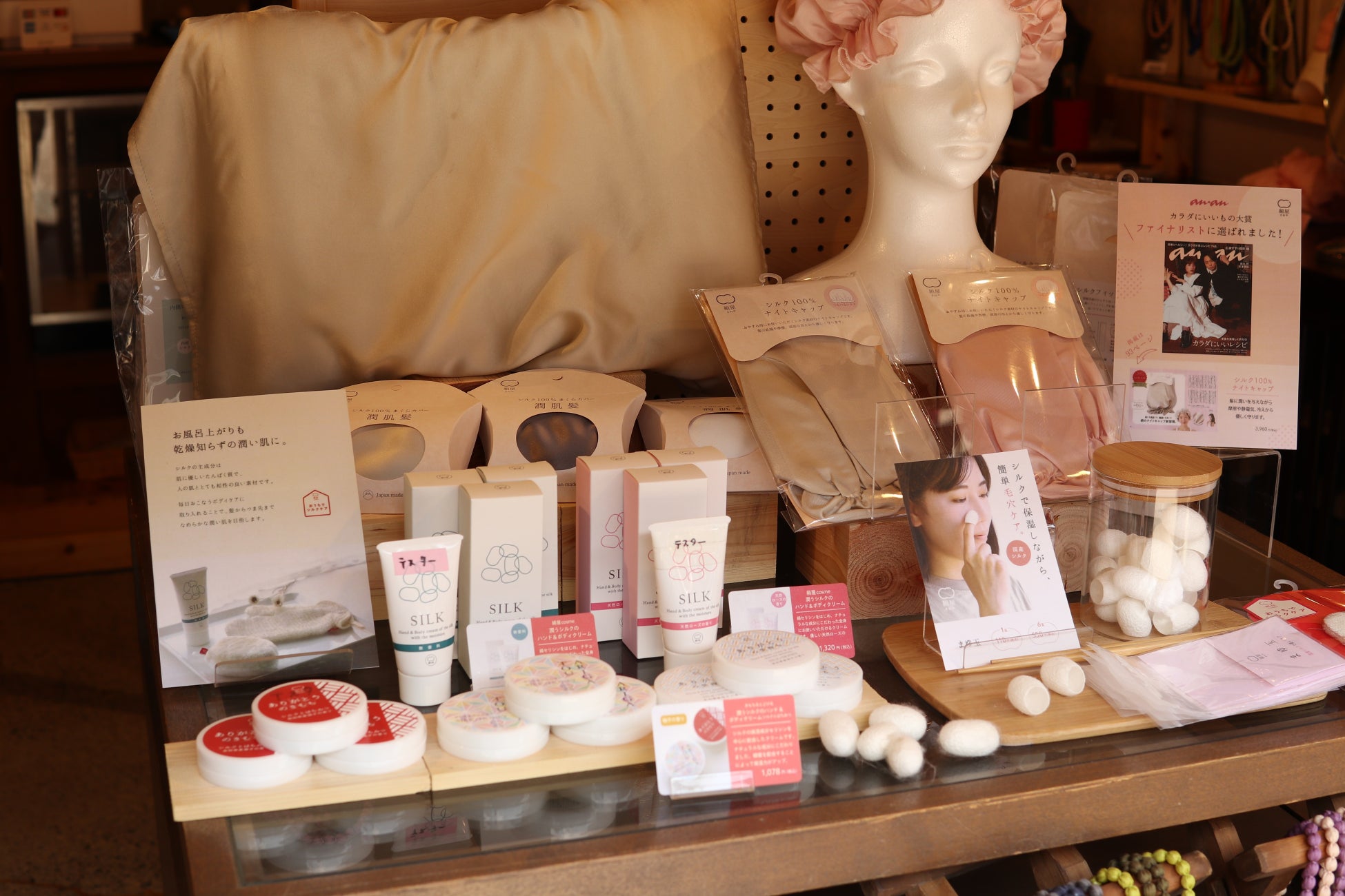 イベント期間中、使用される「にぎたえシルク湯」入浴剤やサンプルで配布される絹の石鹸をはじめ、絹屋が手掛けるさまざまなアパレル品やコスメ商品も販売いたします。これらの商品は、養蚕業の魅力と伝統を反映し、人と環境に優しい素材で作られています。