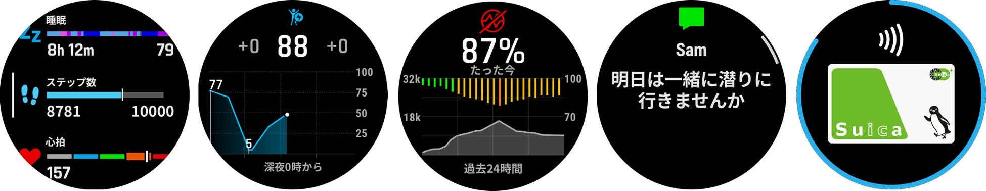 通知機能※1、ライフログ(ステップ数、睡眠管理、ストレス、Body Battery、消費カロリー、血中酸素トラッキングなど)、Suica※2対応 |