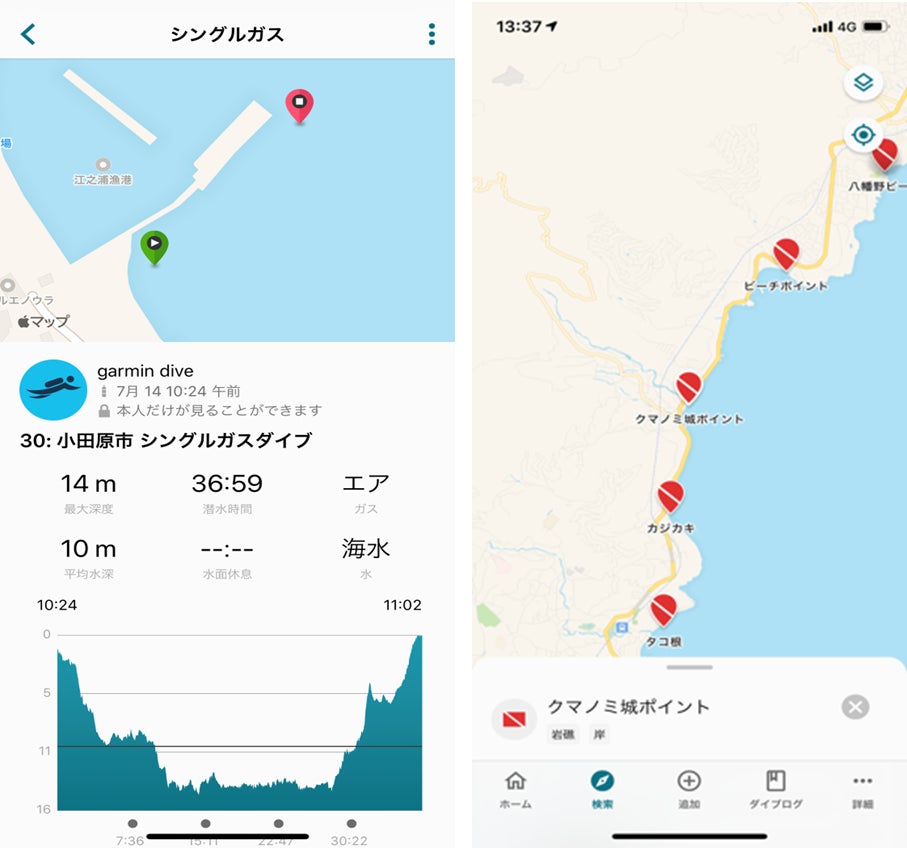 アプリを「Descent」とペアリングすると、潜水記録を自動的に同期してアップロードします。エントリー地点、エキジット地点や、最大・平均水深、水深変化のタイムライン、詳細データの確認が可能です。