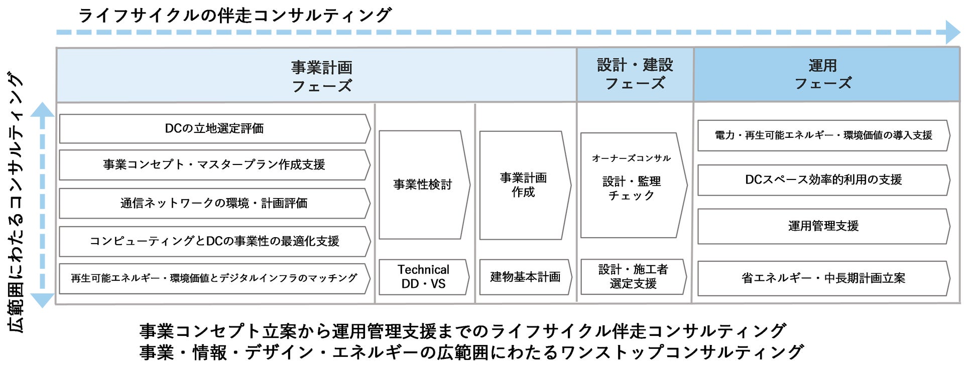 •インターコネクションDCからハイパースケールDCまで、さまざまなタイプのDCの要求を理解して事業計画の立案を支援し、それを実現する建築・設備・エネルギー・情報・運用までの幅広く高度なワンストップコンサルティングを提供します。
