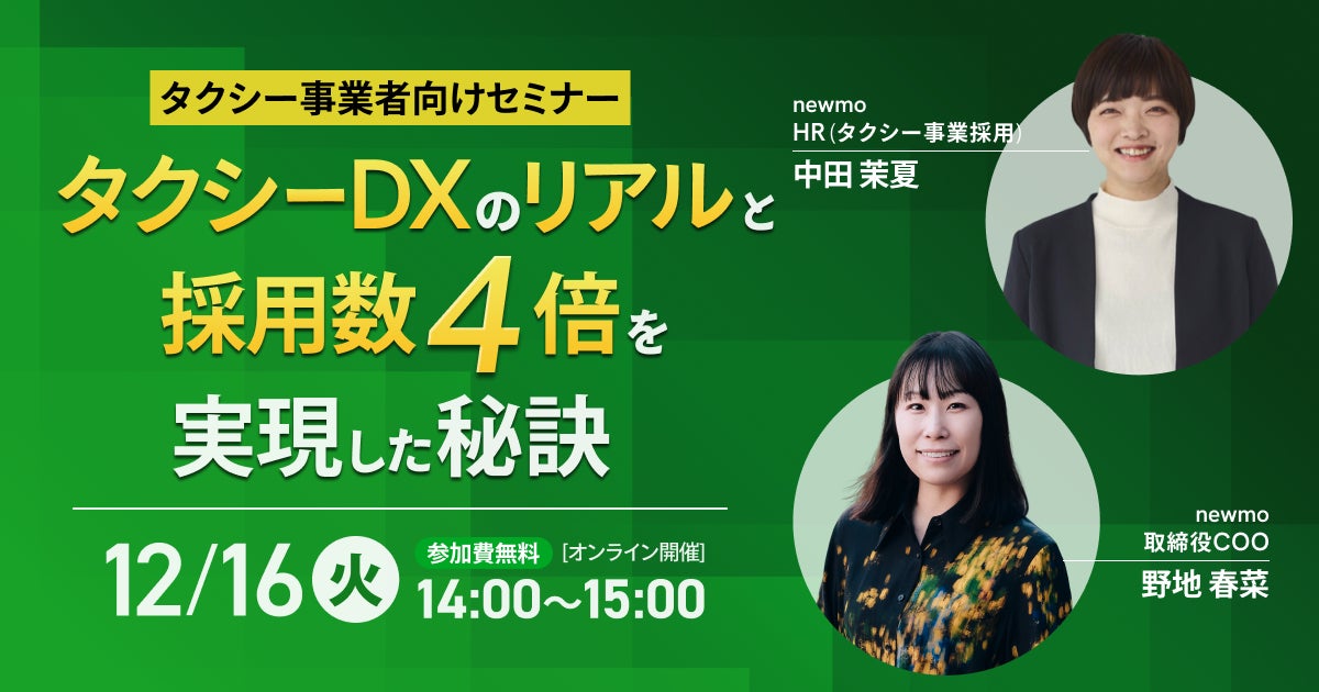 newmo株式会社(本社:東京都港区、代表取締役CEO:青柳直樹)は、タクシー会社向け無料オンラインセミナー「タクシー業界の変革最前線 ― タクシーDXのリアルと採用数4倍を実現した秘訣」を2025年12月16日(火)に開催いたします。