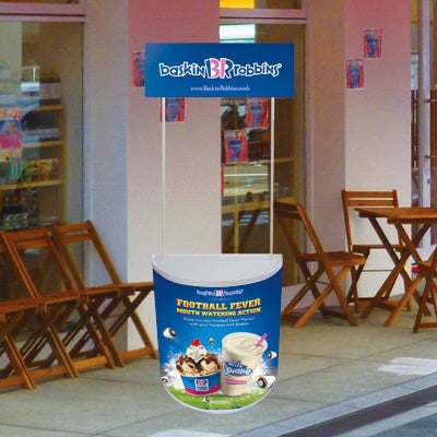 大型バックボードのケースには、天板も付いているのでカウンターテーブルとしても使用可能で、側面には印刷もできるので、目を引くオリジナルなカウンターも作成できます。