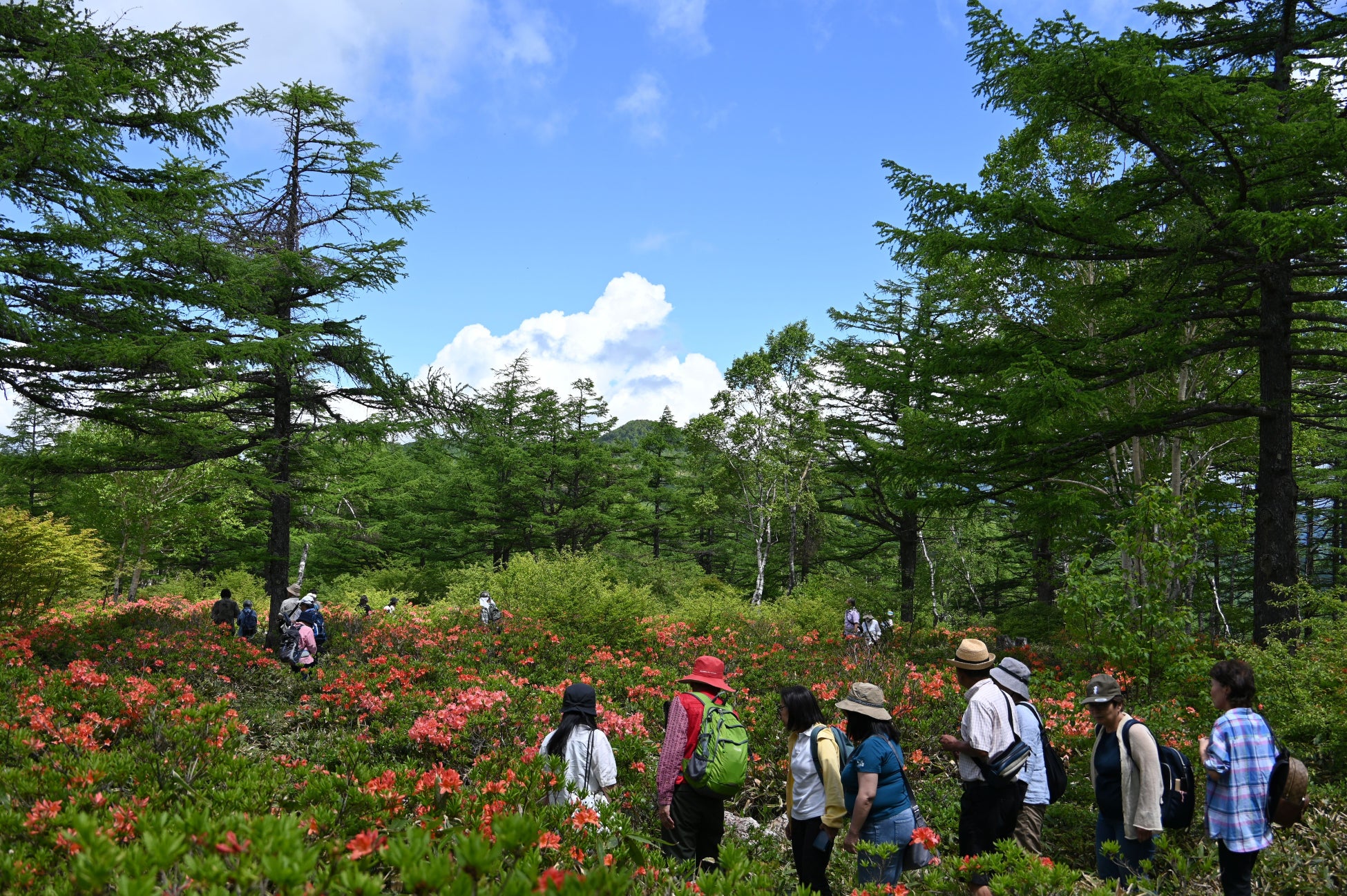 標高1,700メートルの高原一帯に広がる“日本一のレンゲツツジ群落”は、圧巻のスケールと鮮やかな朱色のコントラストで訪れる人々を魅了します。
