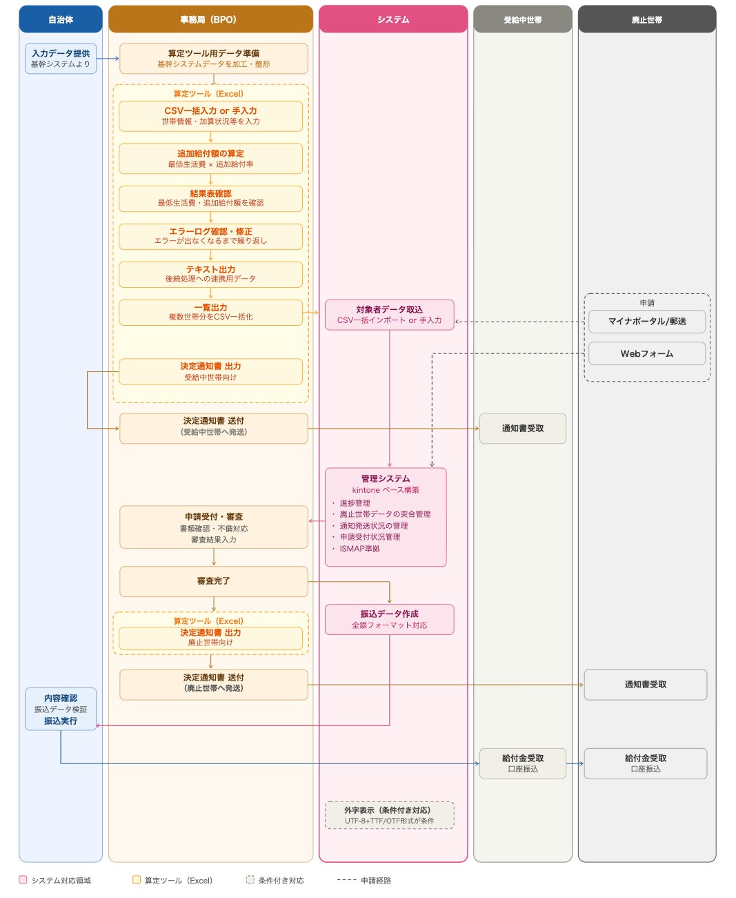 廃止世帯については保有するマスターデータが古く、申請データとの突合作業が煩雑になりやすいという問題があります。また、申請受付から審査・通知発送・振込までの進捗を正確に把握・管理するための仕組みが必要となります。さらに、業務開始スケジュールが迫る中で、短期間でのシステム構築が求められる点も、多くの現場で共通する課題です。