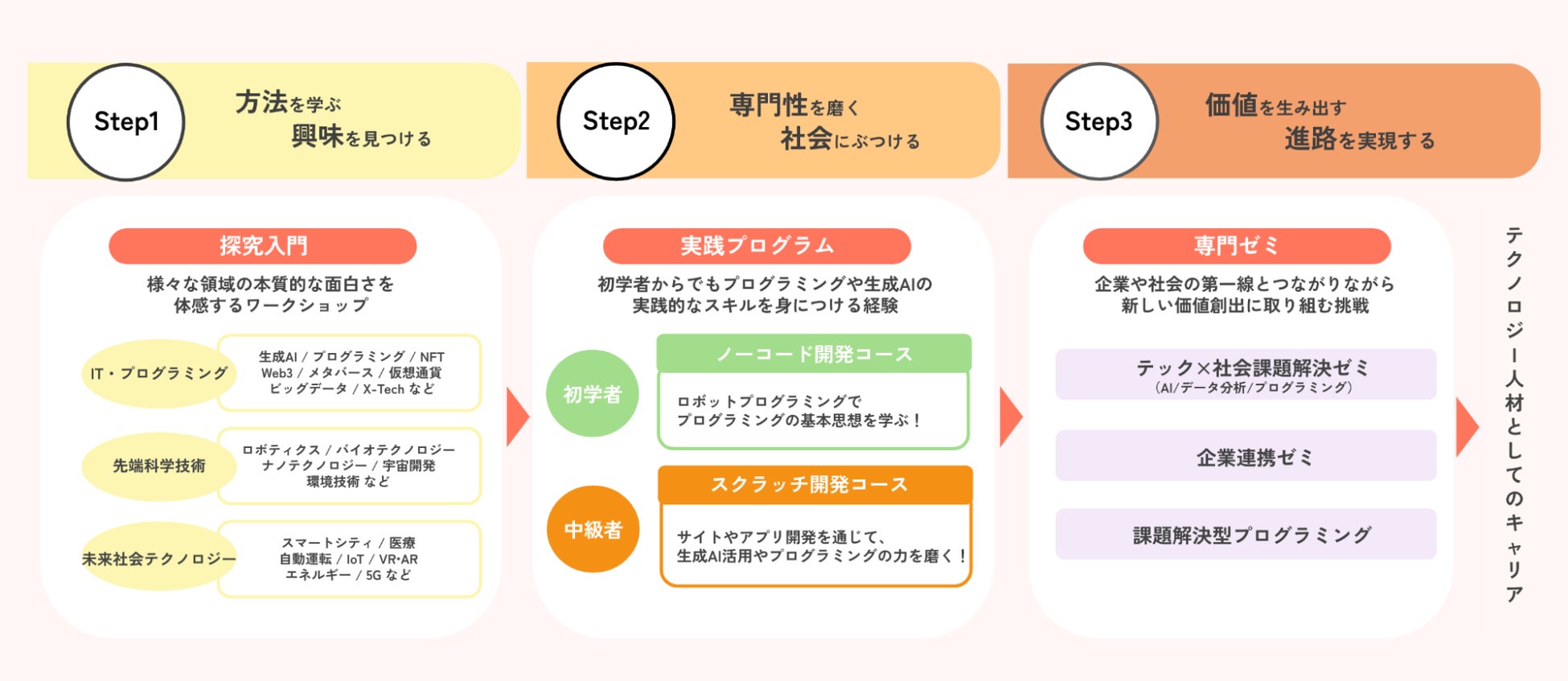 生成AIの活用やデータを用いた課題解決、プロトタイピングのスキルなど、文系理系を問わずこれからの時代に求められる力を、前提知識や興味がなくても「夢中になりながら」体感して学べるような初学者向けのプログラムを用意しています。サイトやアプリ開発を通じてプログラミングの実践的な力を身につけられる機会も。様々な分野の学びを今後拡大していきます。