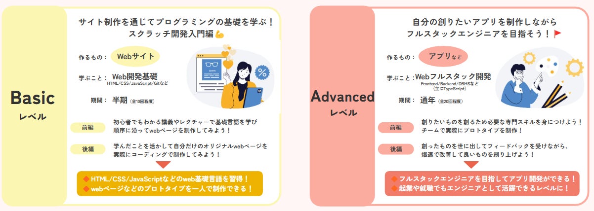サイト制作を通じてプログラミングの基礎スキルを身につける経験。自分のポートフォリオサイトやサービスサイトを作りながらWeb開発の基礎を学ぶ「Basic」、さらに高いレベルでアプリ等の自分の創りたいものを形にしながら、フルスタックエンジニアを目指した力を身につける実践的な「Advanced」のプログラムを開講します。