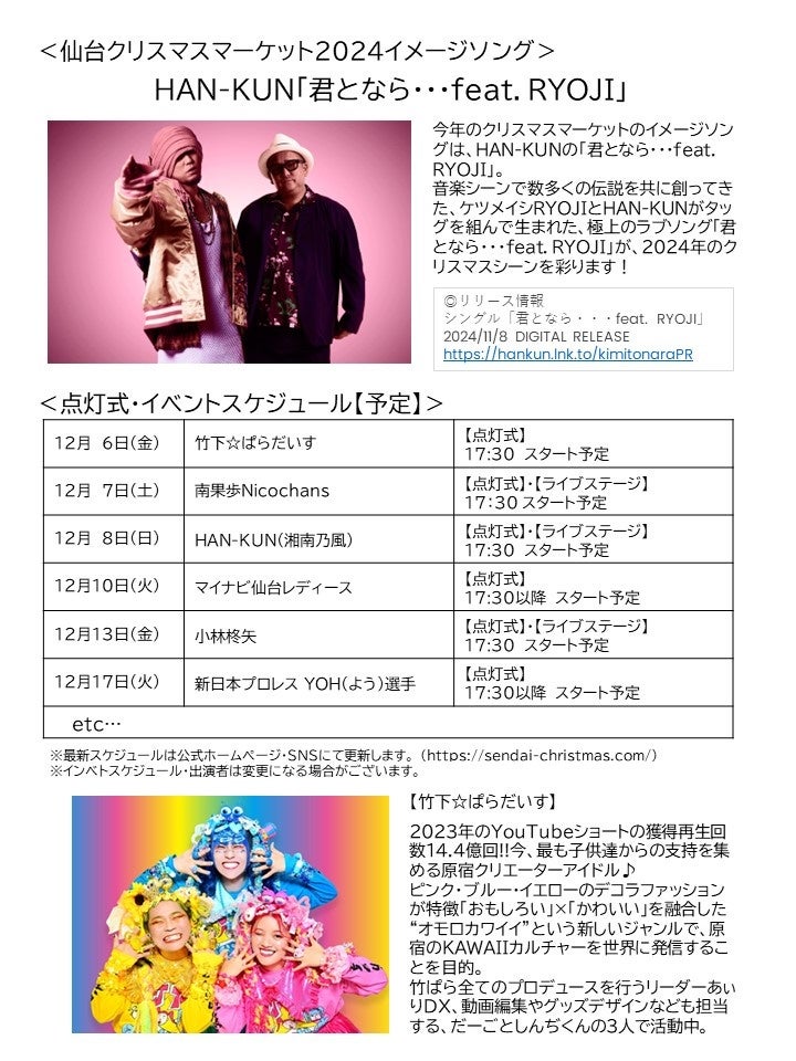 TV-CM・関連番組他、会場を盛り上げるイメージソングには湘南乃風「HAN-KUN」とケツメイシ「RYOJI」が初タッグを組んで制作した極上のラブソング「君となら・・・feat. RYOJI」が決定。また東北最大級約5mのクリスマスツリーの前で毎日行われる点灯式には、今最も子供達から支持を集める原宿クリエイターアイドル「竹下☆ぱらだいす」やイメージソングを歌う「HAN-KUN」など、仙台のクリスマスを盛り上げるアーティストやゲストが続々登場します。 2024SENDAI光のページェントと連携したクリスマスイベントで、特別なひとときをお楽しみください。