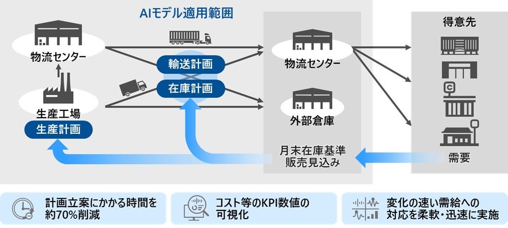 本システムは、数理最適化技術を活用し、40を超える制約条件や相反する約10個のKPIなどのお客さま固有の要件を柔軟に取り込みます。これにより、システムを構成する基本機能を部品として保有しながら、計画立案に必要な業務ルールをお客さまの業務モデルに合わせて細部まで反映するセミオーダー型のソリューションを実現し、季節変動により需要が大きく左右されるニチレイ・アイスの包装氷の生産・在庫・輸送の計画立案にかかる時間を約70%削減することを確認しています。高精度かつ実運用に十分対応できるサプライチェーン全体の計画立案が可能となり、従来の汎用的なパッケージでは実現できなかった現場に根ざした最適化を実現します。
