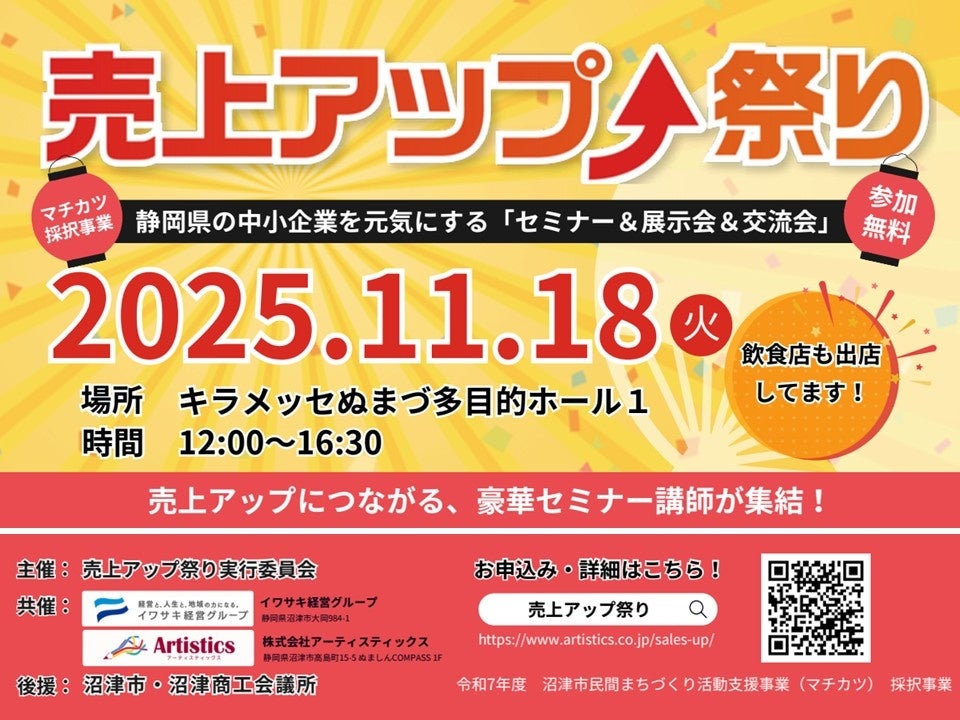 一般社団法人静岡ベンチャースタートアップ協会(代表理事:篠原豊、所在地:静岡県浜松市 以下、SVSA)は、静岡にゆかりのあるベンチャー及びスタートアップ企業の奨励や若手起業家の育成などを通じて、静岡県における起業文化発展を目指して活動しています。この度、2025年11月18日(月)に静岡県沼津市で開催される「売上アップ祭り2025」に出展するとともに、セミナー登壇を行います。