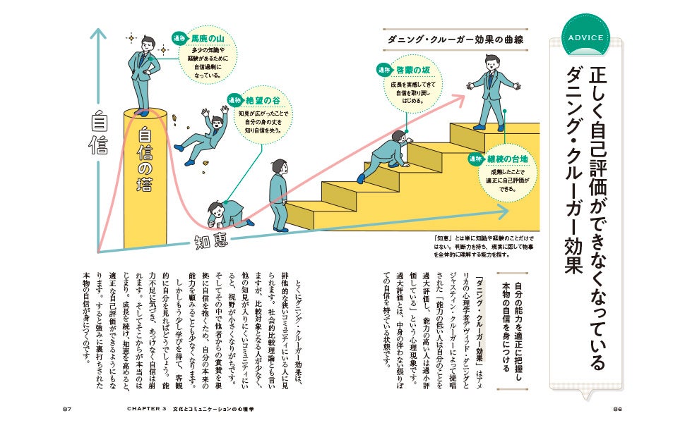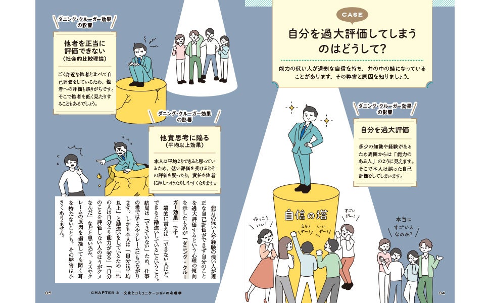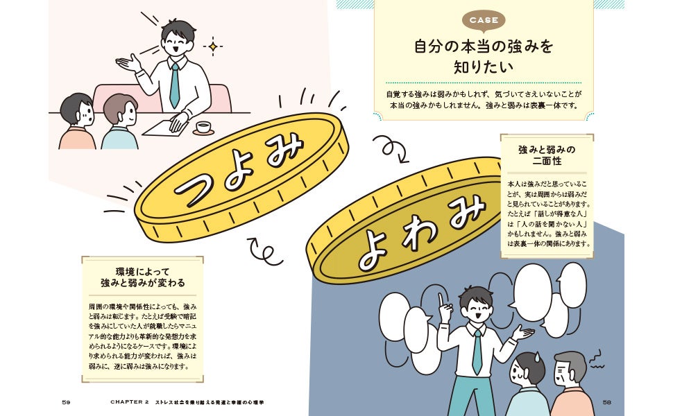 「1項目=4ページ」単位を基本に構成される本書は、冒頭の見開きで大きなフルカラーイラストとキャプションが掲載され、読む人に直感的な理解を促します。心理学の知識が初めての方でもわかりやすいよう、豊富なイラストとシンプルな説明が展開されており、気軽に学びながら心理学の本質が身につきます。