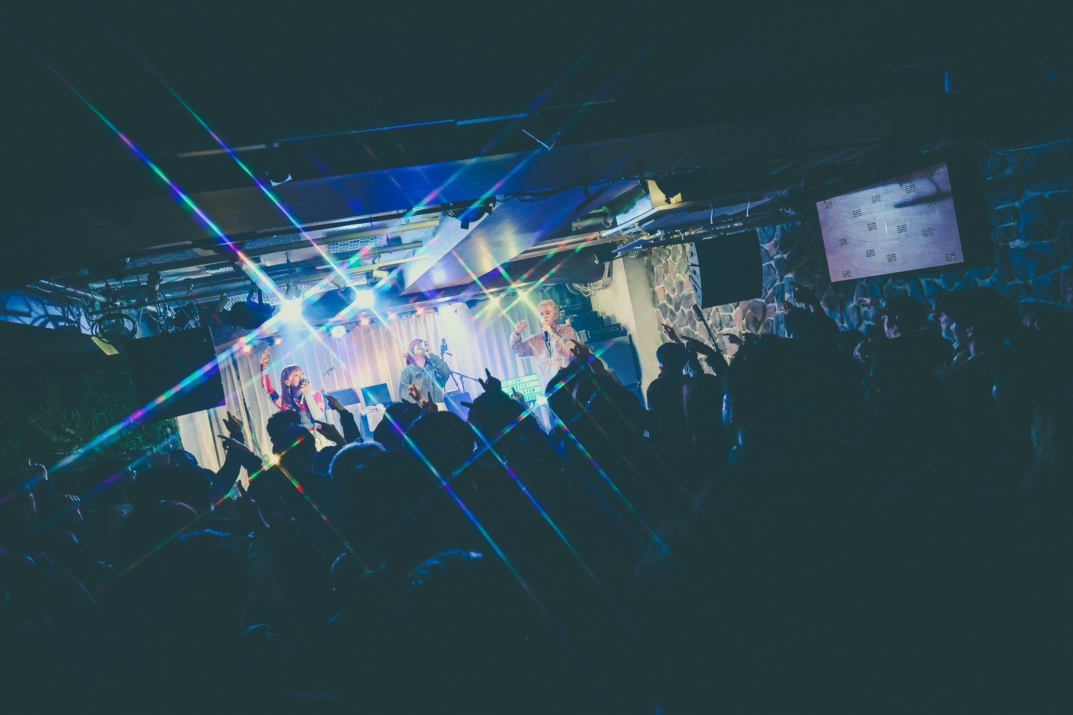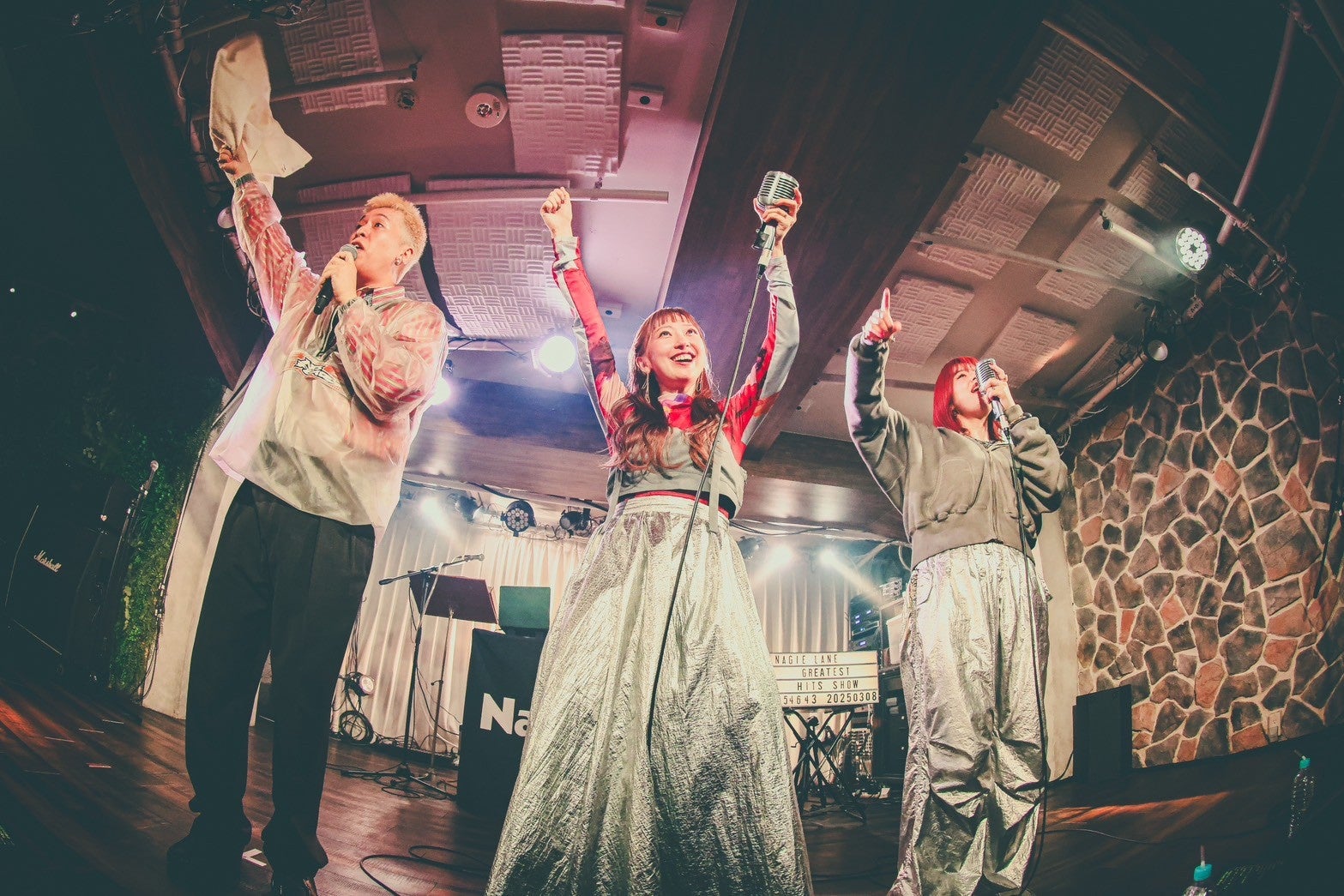 温かな拍手に導かれるように、ステージに姿を現したメンバー。アイコンタクトを取りあい、スゥッとブレスを取ると「654643 A Cappella」を導いた。アカペラで紡がれていく美しいハーモニーは、まさにNagie Laneの真骨頂。それぞれの呼吸を捕まえて、舞台上で声を重ねる時間を愛しむように、歌声を響かせていった。「イケナイフタリ」からは、トラックに乗せて歌うスタイルにチェンジし、一気に華やかな雰囲気へ。mayuがキラキラ成分を振りまけば、mikakoはグルーヴィーな節回しで魅了、barattiは絶妙な按配で楽曲を彩っていく。彼らが生み出す空気に乗せられたのか、自然と左右に揺れたり、クラップをしたりするオーディエンス。LIVE STUDIO LODGEの隅々まで、音楽の波が心地よく広がっていることを感じさせた。